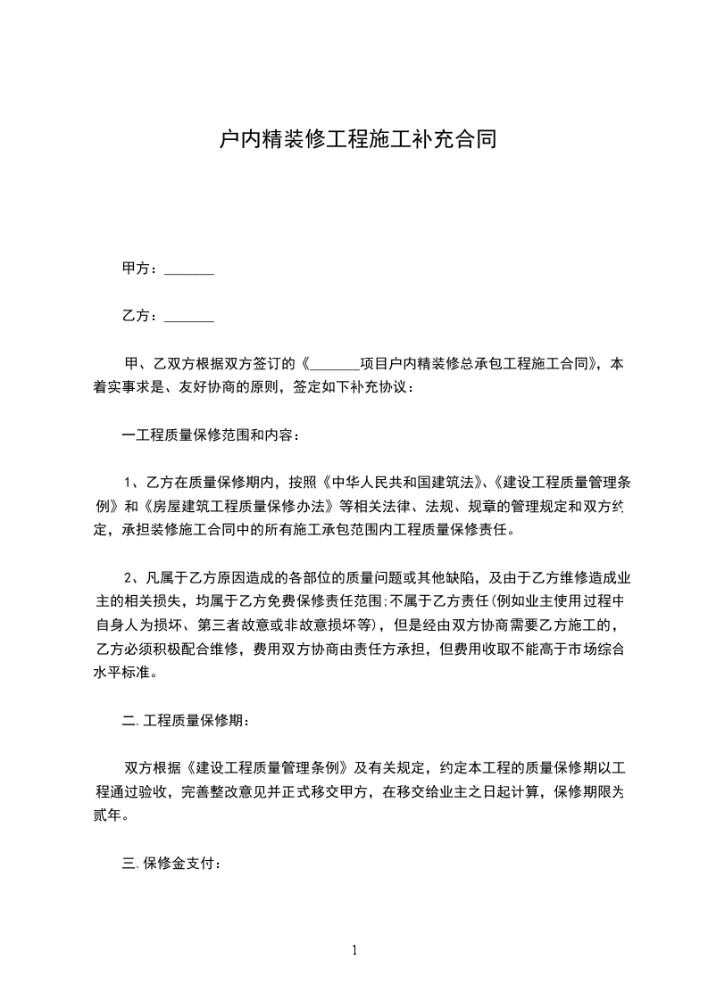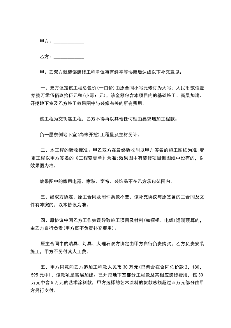 甲方:(以下简称甲方)乙方:(以下简称乙方)本合同的签订为乙方装修劳务分包工程的有关状况已经作了必要的理解,承受目前施工现场及甲方供给的生活区现状,并已经对有关规定进展了充分的理解,乙方情愿就本分包工程与甲方签订此协议书,并根据甲方的有关要求和确定的工作范围,乙方同意根据甲方的有关要求按期组织人员进场,严格执行甲方关本工程的施工进度方案支配。有关本项工程施工及责任义务等,经甲方双方经过仔细协商,按照、中华人民共和国建筑法及其它有关法律、行政法规,遵循公平、自愿、公正和诚恳信誉的原那么,双方就本工程施工工程协商全都,订立本合同,并作为甲乙双方的合约文件。