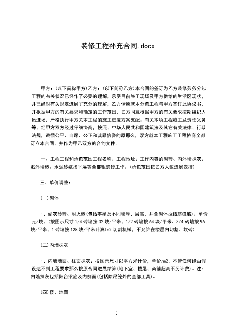 一、工程工程和承包范围工程名称:工程地址:工作内容的砌砖、内外墙抹灰、贴外墙砖、水泥砂浆找平层等全部粗装修工作。(承包范围按乙方人数进展安排)