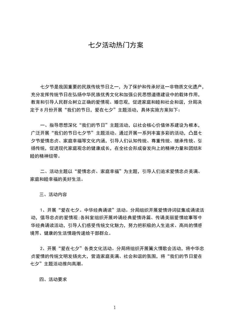 1、开展“爱在七夕。中华经典诵读”活动。分局组织开展爱情诗词征集或诵读活动,倡导忠贞的爱情观;各科室组织开展吟诵经典爱情诗篇、传诵美丽爱情故事等中华经典诵读活动,引导人们感受传统文化魅力,努力把积极的人生追求、高尚的情感境界、健康的生活情趣传递给干部群众。