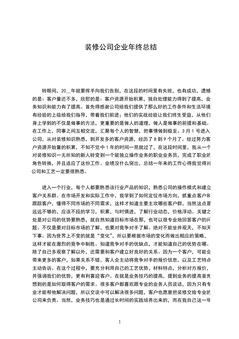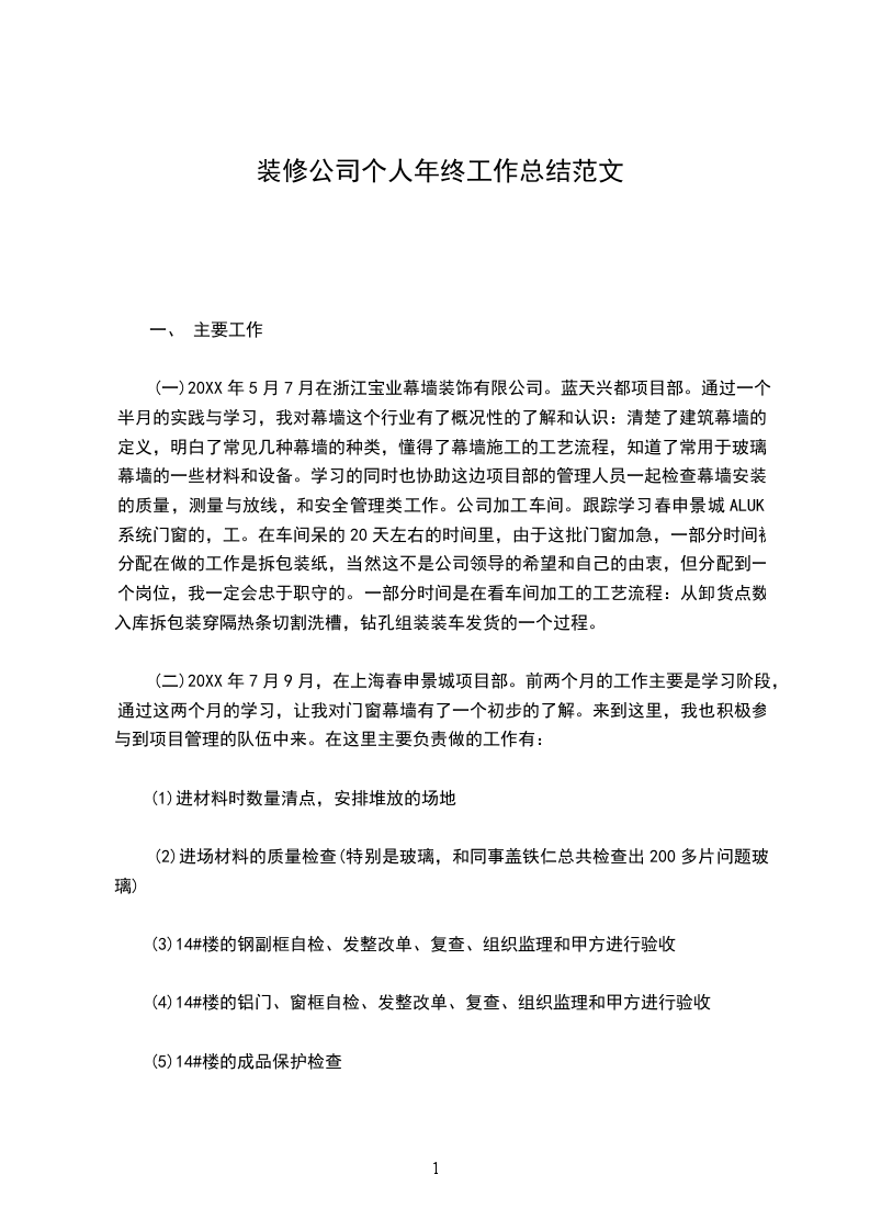 (五)合理安排好自己生活上的事情,做到公私分明。当一个合格的项目经理是我永恒的目标!在明年的工作中,我会继续努力,自觉加强专业知识的学习,虚心求教,不断理清工作思路,总结工作方法,不断掌握方法积累经验。我注重以工作计划为牵引,通过观察、摸索、查阅资料和实践锻炼,努力的提高专业知识。及时地向领导汇报自己在工作中的思想、感受以及工程进展情况,及时纠正和弥补自身的不足和缺陷。我们的工作需要团结才有力量,需要合作才会成功,鼠标加水泥把我们的工作推向前进吧!装修公司个人年终工作总结范文又是一年春来到,在这辞旧迎新之际,我向大家汇报一下我在本年的工作情况及20XX年的工作计划。