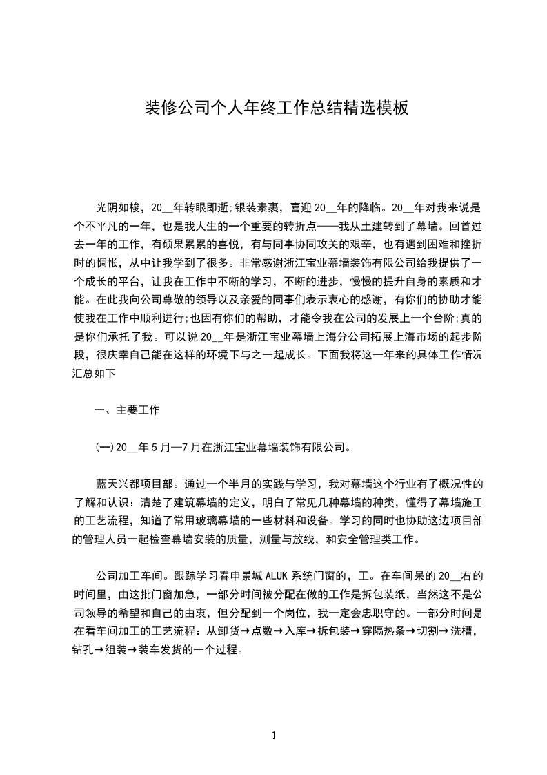(5)鉴于文承苑的淋水试验经验,建议加大平开扇搭接量,更换防雨条,同时尽量减少拼接;另外,鉴于文承苑的维修经验,对于50平开扇也不宜采用原来的防雨条,不仅防水效果不好,还造成扇关不严,为以后维修造成一定的麻烦。同时在推拉窗的窗型选择及尺寸选定上也要慎重考虑,若扇长宽比过大,很容易造成扇推拉不稳,后期维修较难处理。以上是我在半年的工作中所总结的一些问题和认识,毕竟见识有限,于公于私,若有不当之处还望大家批评指正。装修公司个人年终工作总结范文紧张、忙绿、丰盛、而又难忘的20xx已经过去,充满期待的20xx已经来到,回首过去一年的工作,既有收获的喜悦也有不足的反思。在这新年伊始之际,很有必要静下心来对一年来的生活、工作、学习进行回顾、梳理、和总结,提炼经验总结教训,便于新年度更好更快的完成今年的任务打下基础。现将本人的年度总结向各位领导汇报如下,愿与各位同仁共勉。