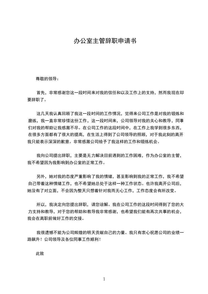 我向公司提出辞职,主要是无力解决目前遇到的工作困难,作为办公室的主管,我不希望因为我影响到办公室的正常工作。