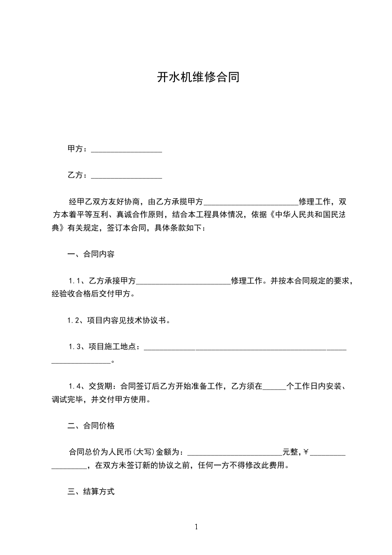 经甲乙双方友好协商,由乙方承揽甲方________________________修理工作,双方本着平等互利、真诚合作原则,结合本工程具体情况,依据《中华人民共和国民法典》有关规定,签订本合同,具体条款如下:
