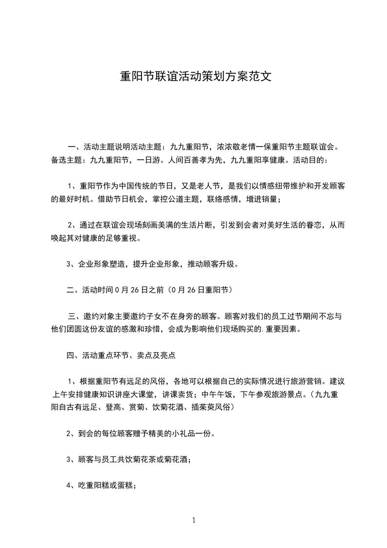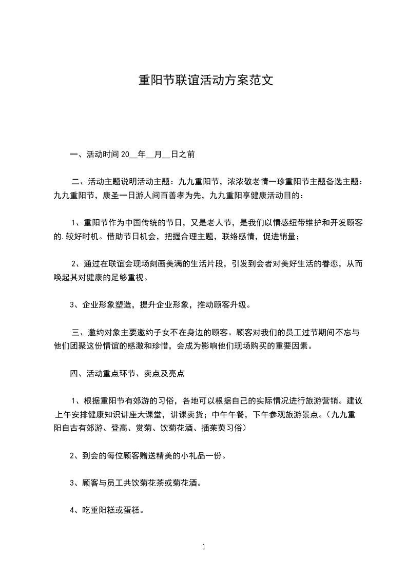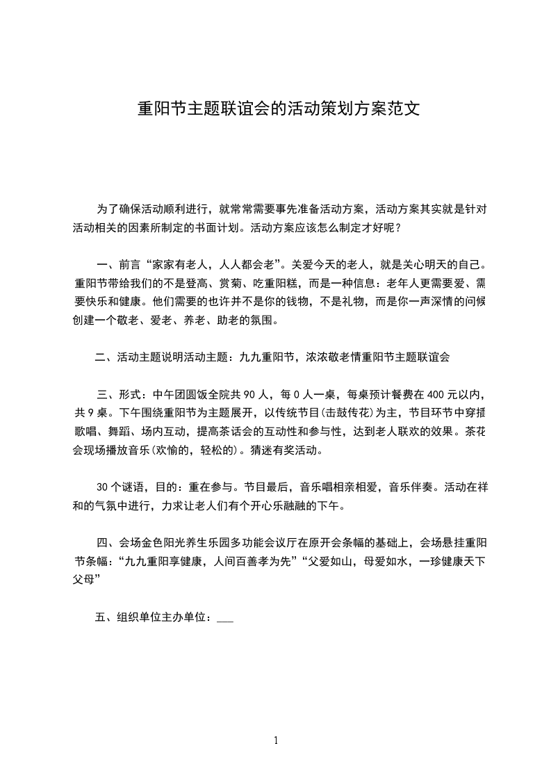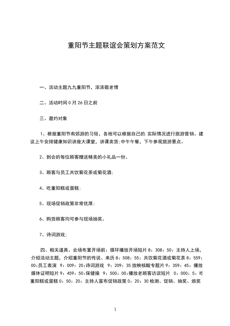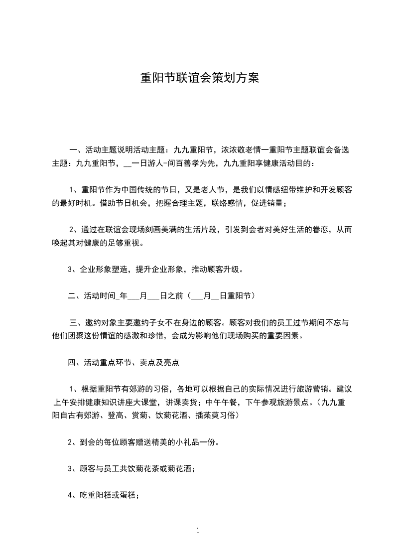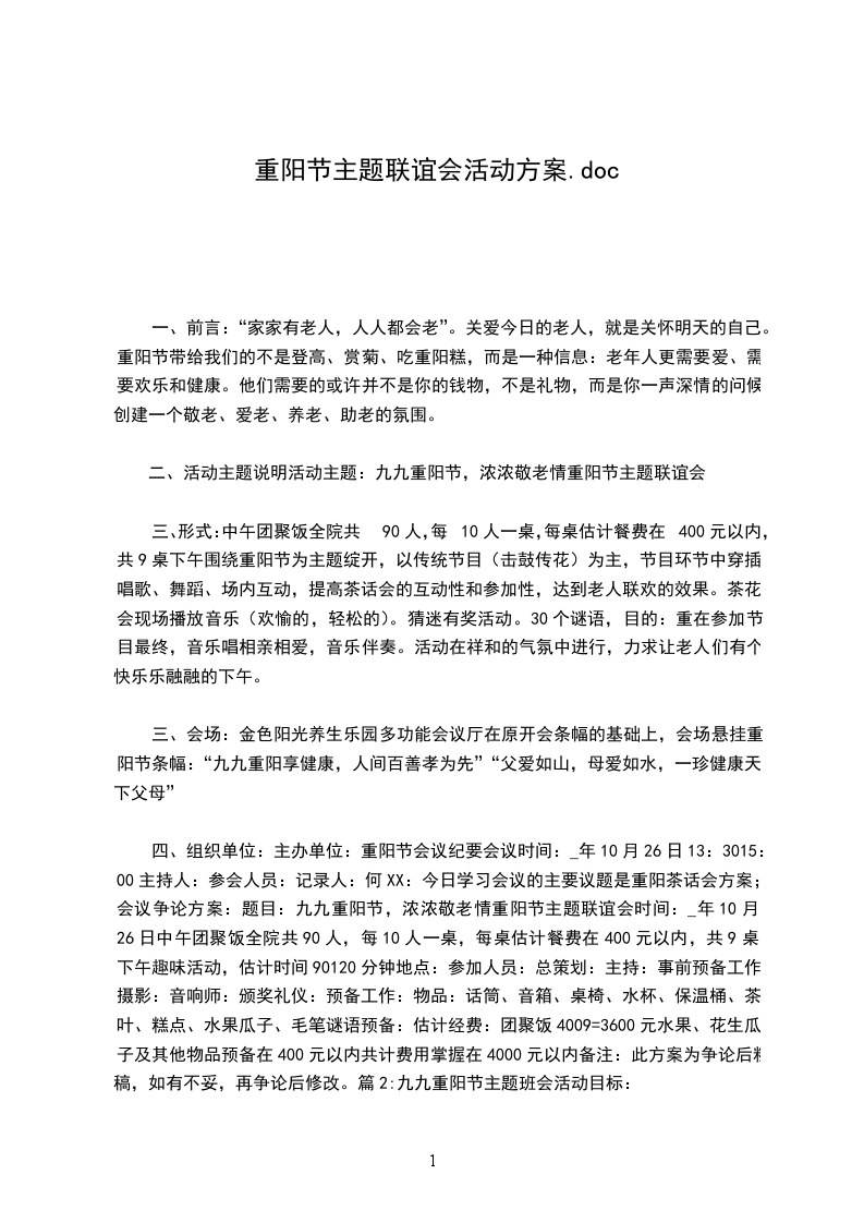 四、组织单位:主办单位:重阳节会议纪要会议时间:_年10月26日13:3015:00主持人:参会人员:记录人:何XX:今日学习会议的主要议题是重阳茶话会方案;会议争论方案:题目:九九重阳节,浓浓敬老情重阳节主题联谊会时间:_年10月26日中午团聚饭全院共90人,每10人一桌,每桌估计餐费在400元以内,共9桌下午趣味活动,估计时间90120分钟地点:参加人员:总策划:主持:事前预备工作:摄影:音响师:颁奖礼仪:预备工作:物品:话筒、音箱、桌椅、水杯、保温桶、茶叶、糕点、水果瓜子、毛笔谜语预备:估计经费:团聚饭4009=3600元水果、花生瓜子及其他物品预备在400元以内共计费用掌握在4000元以内备注:此方案为争论后粗稿,如有不妥,再争论后修改。篇2:九九重阳节主题班会活动目标: