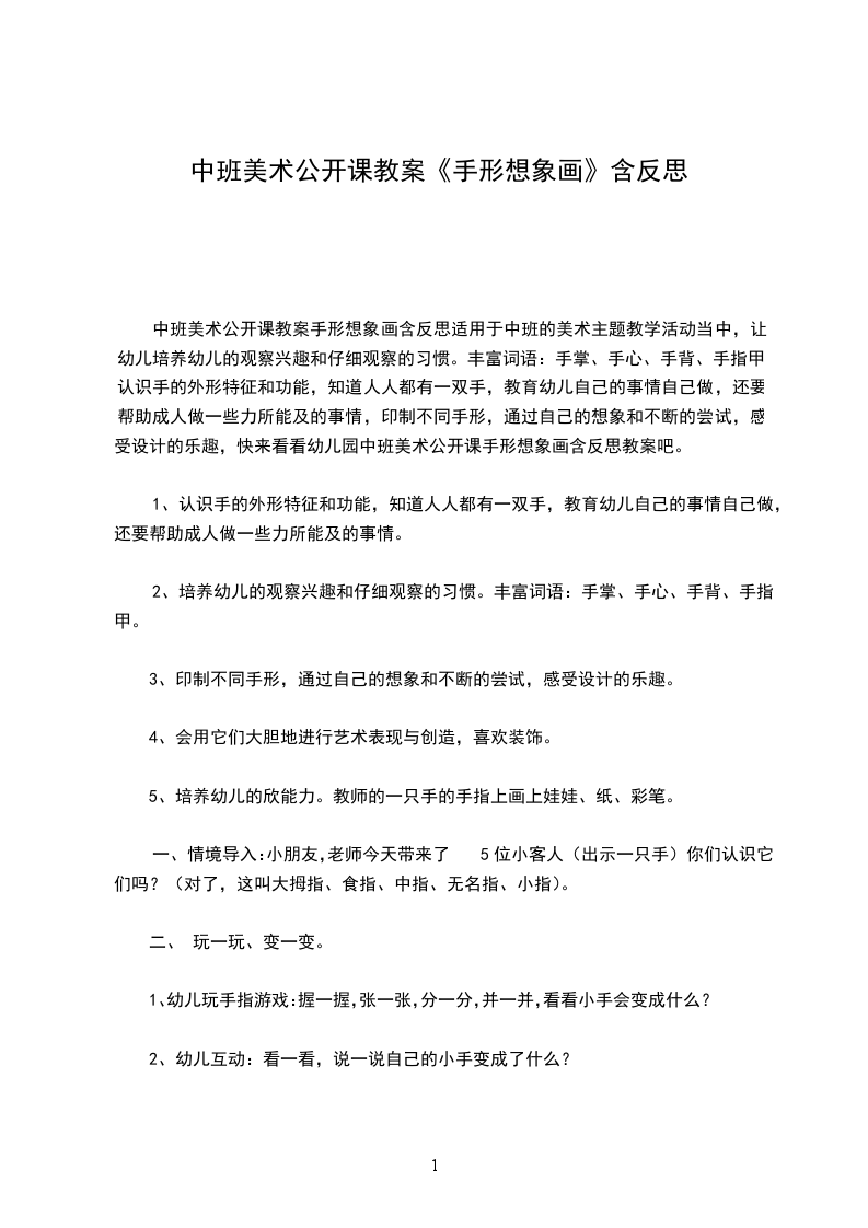 中班美术公开课教案手形想象画含反思适用于中班的美术主题教学活动当中,让幼儿培养幼儿的观察兴趣和仔细观察的习惯。丰富词语:手掌、手心、手背、手指甲,认识手的外形特征和功能,知道人人都有一双手,教育幼儿自己的事情自己做,还要帮助成人做一些力所能及的事情,印制不同手形,通过自己的想象和不断的尝试,感受设计的乐趣,快来看看幼儿园中班美术公开课手形想象画含反思教案吧。