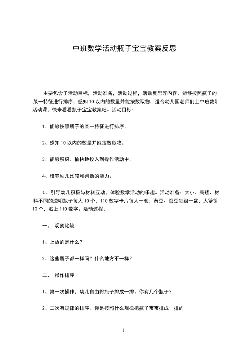 主要包含了活动目标,活动准备,活动过程,活动反思等内容,能够按照瓶子的某一特征进行排序,感知10以内的数量并能按数取物,适合幼儿园老师们上中班数学活动课,快来看看瓶子宝宝教案吧。活动目标:
