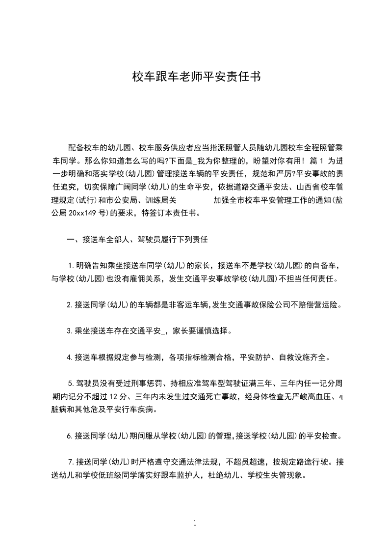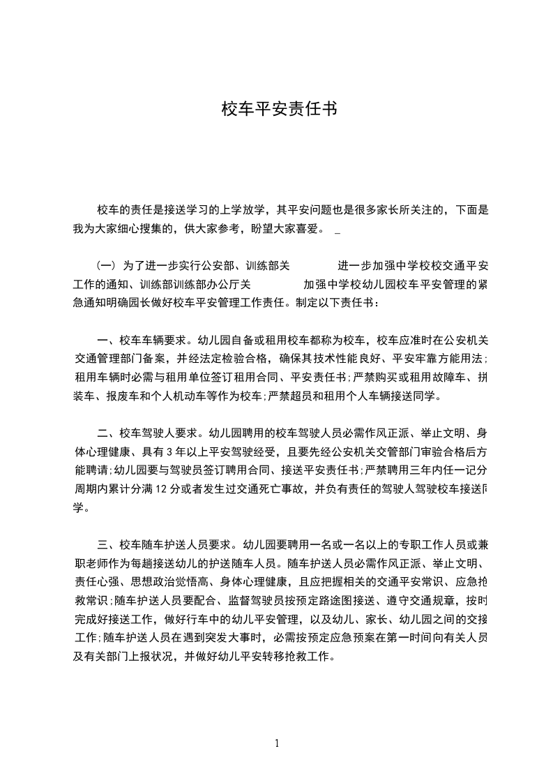 五、按要求填写好交接登记和接送登记。 负责人(签字):_ 责任人(签字):_ 20_年_月_日 篇3 为了进一步实行公安部、训练部关 进一步加强中学校校交通平安工作的通知、训练部训练部办公厅关 加强中学校幼儿园校车平安管理的紧急通知明确园长做好校车平安管理工作责任。制定以下责任书: