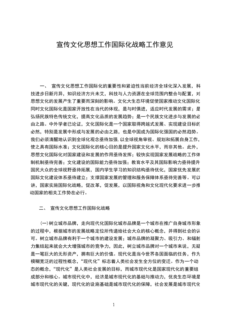 一、 宣传文化思想工作国际化的重要性和紧迫性当前经济全球化深入发展,科技进步日新月异,知识经济方兴未艾,科技与人力资源在全球范围内整合与配置,对思想文化的发展产生了重要而深刻的影响。文化大生态环境促使国家推动文化国际化,同时文化国际化是国家开放性在当代的体现,是与时俱进,适应时代发展的需求;是弘扬民族特色传统文化,提高文化品质的发展趋势;是一个民族文化进步与发展的必由之路。中外学者已论证,文化国际化是一个国家取得跨越式发展、实现建设目标的必然,特别是发展中形成与发展的必由之路,也是中国成为国际化强国的必然趋势。我们必须清醒地认识到全球化观念亟待加强,以全球视角审视、规划和拓展自身工作,使之具有国际水准;文化国际化的核心目的是提升国家文化水平,而非其他。此外,思想文化国际化对国家建设和发展的作用亟待发挥;较快实现国家发展战略的工作体制机制亟待完善;文化建设的国际能力亟待加强;教育水平及其国际影响力亟待提升;国民大众的全球视野亟待拓展,国内学生学习的知识结构亟待优化,国家优先发展的国际文化建设体系亟待建立;支撑国家发展的管理和服务保障体系亟待完善等。可以讲,国家实施国际化战略,促改革,促发展,以国际视角和文化现代化要求进一步推动国家的相关工作势在必行。