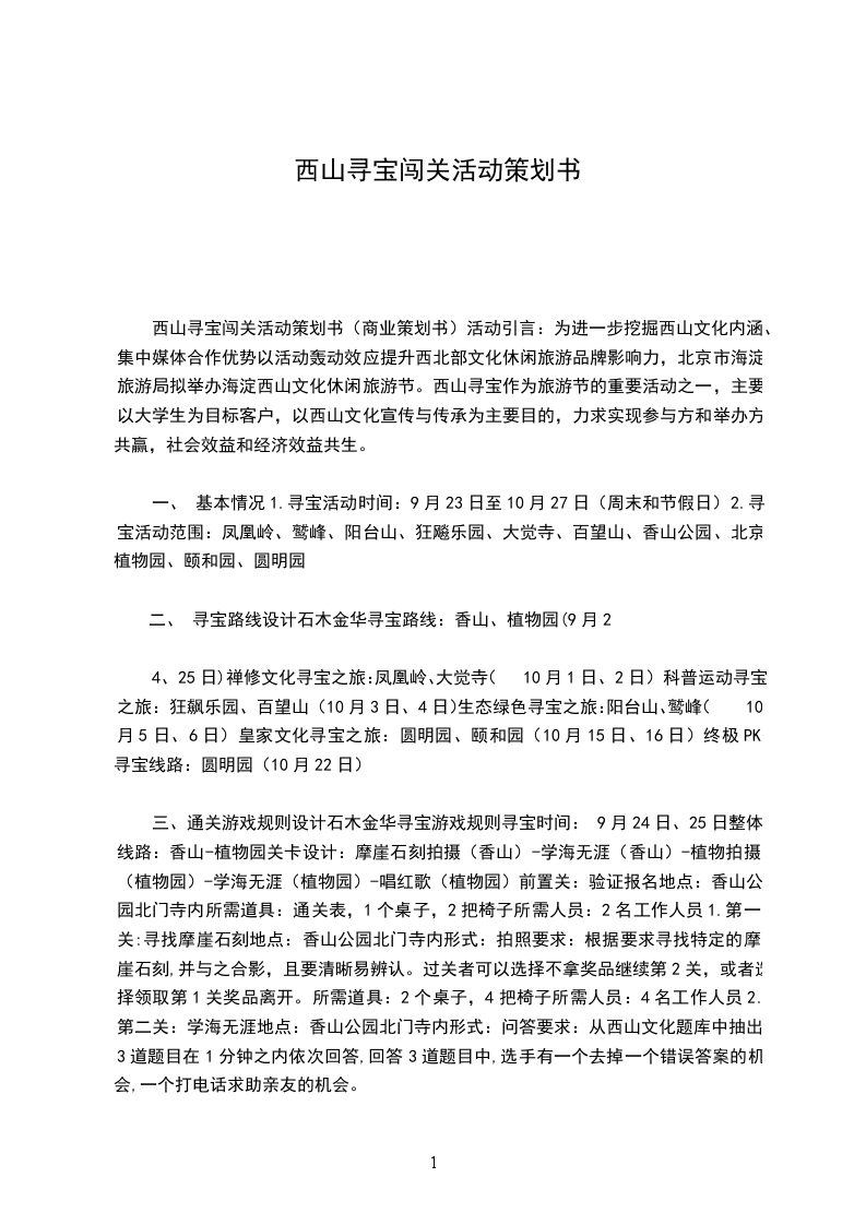 西山寻宝闯关活动策划书(商业策划书)活动引言:为进一步挖掘西山文化内涵、集中媒体合作优势以活动轰动效应提升西北部文化休闲旅游品牌影响力,北京市海淀旅游局拟举办海淀西山文化休闲旅游节。西山寻宝作为旅游节的重要活动之一,主要以大学生为目标客户,以西山文化宣传与传承为主要目的,力求实现参与方和举办方共赢,社会效益和经济效益共生。