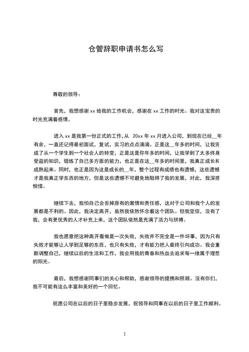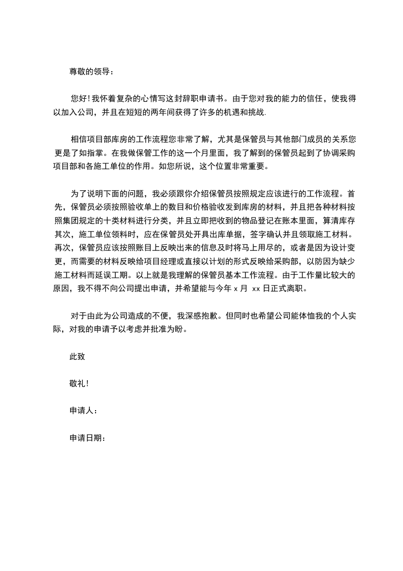 为了说明下面的问题,我必须跟你介绍保管员按照规定应该进行的工作流程。首先,保管员必须按照验收单上的数目和价格验收发到库房的材料,并且把各种材料按照集团规定的十类材料进行分类,并且立即把收到的物品登记在账本里面,算清库存。其次,施工单位领料时,应在保管员处开具出库单据,签字确认并且领取施工材料。再次,保管员应该按照账目上反映出来的信息及时将马上用尽的,或者是因为设计变更,而需要的材料反映给项目经理或直接以计划的形式反映给采购部,以防因为缺少施工材料而延误工期。以上就是我理解的保管员基本工作流程。由于工作量比较大的原因,我不得不向公司提出申请,并希望能与今年x月 xx日正式离职。