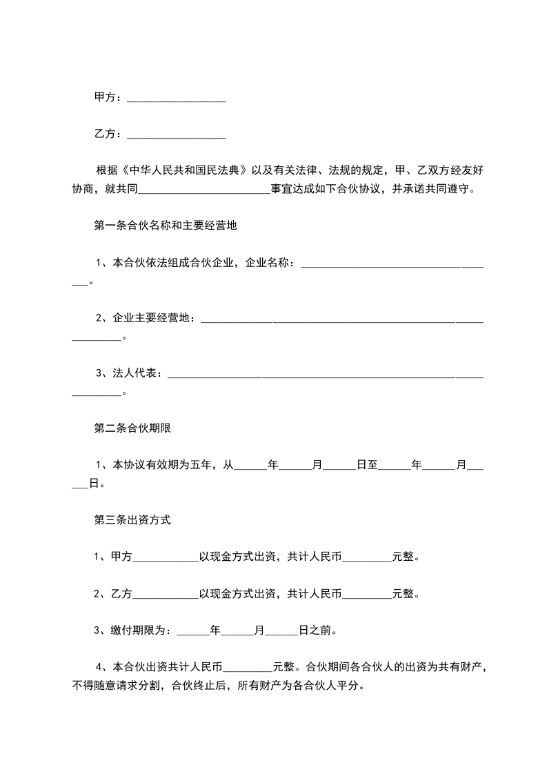 4、本合伙出资共计人民币_________元整。合伙期间各合伙人的出资为共有财产,不得随意请求分割,合伙终止后,所有财产为各合伙人平分。