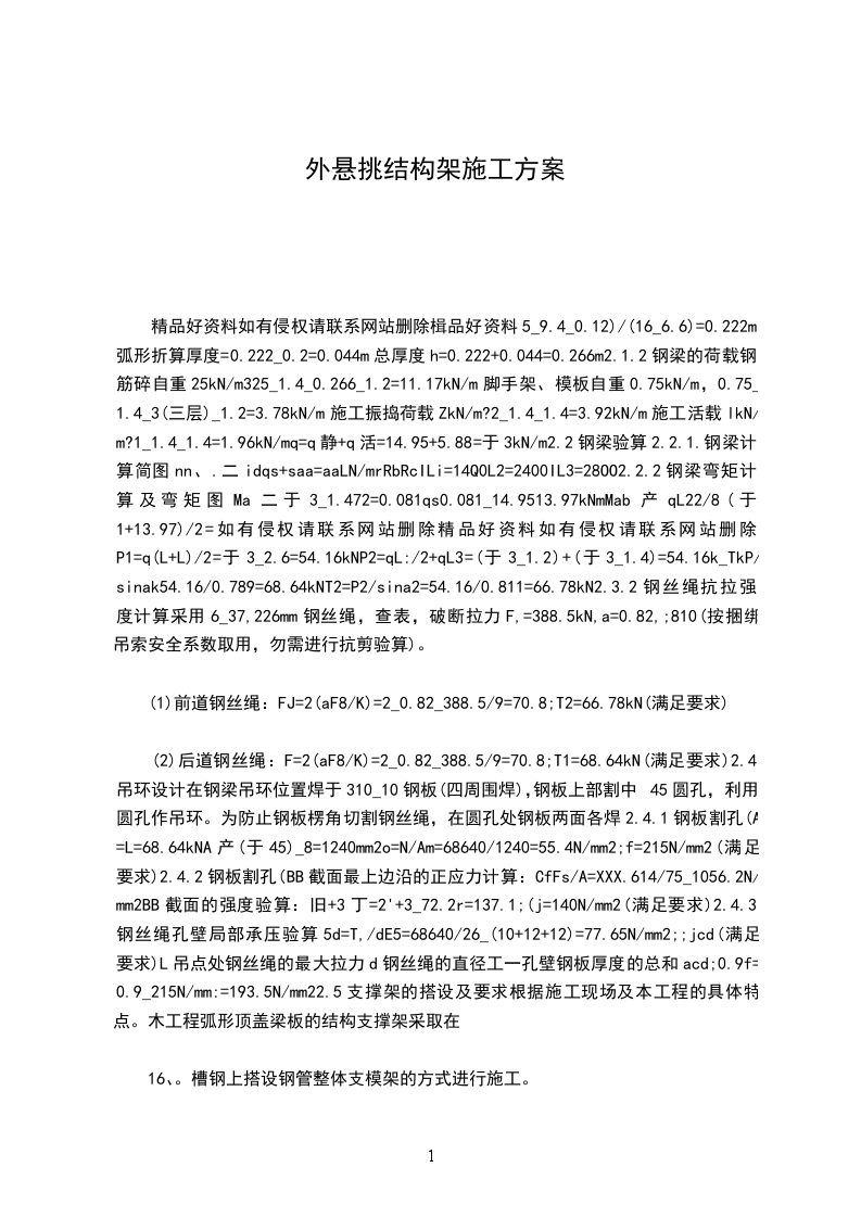 (2)后道钢丝绳:F=2(aF8/K)=2_0.82_388.5/9=70.8;T1=68.64kN(满足要求)2.4吊环设计在钢梁吊环位置焊于310_10钢板(四周围焊),钢板上部割中45圆孔,利用圆孔作吊环。为防止钢板楞角切割钢丝绳,在圆孔处钢板两面各焊2.4.1钢板割孔(A=L=68.64kNA产(于45)_8=1240mm2o=N/Am=68640/1240=55.4N/mm2;f=215N/mm2(满足要求)2.4.2钢板割孔(BB截面最上边沿的正应力计算:CfFs/A=XXX.614/75_1056.2N/mm2BB截面的强度验算:旧+3丁=2'+3_72.2r=137.1;(j=140N/mm2(满足要求)2.4.3钢丝绳孔壁局部承压验算5d=T,/dE5=68640/26_(10+12+12)=77.65N/mm2;;jcd(满足要求)L吊点处钢丝绳的最大拉力d钢丝绳的直径工一孔壁钢板厚度的总和acd;0.9f=0.9_215N/mm:=193.5N/mm22.5支撑架的搭设及要求根据施工现场及本工程的具体特点。木工程弧形顶盖梁板的结构支撑架采取在