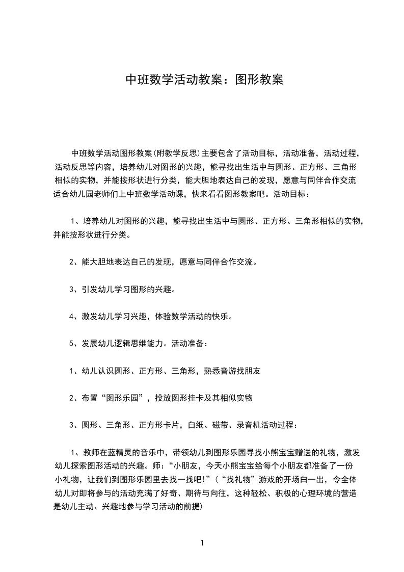 中班数学活动图形教案(附教学反思)主要包含了活动目标,活动准备,活动过程,活动反思等内容,培养幼儿对图形的兴趣,能寻找出生活中与圆形、正方形、三角形相似的实物,并能按形状进行分类,能大胆地表达自己的发现,愿意与同伴合作交流,适合幼儿园老师们上中班数学活动课,快来看看图形教案吧。活动目标: