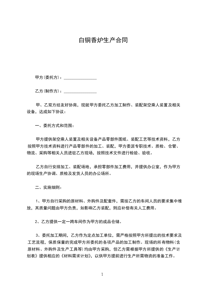 白金怀炉生产合同