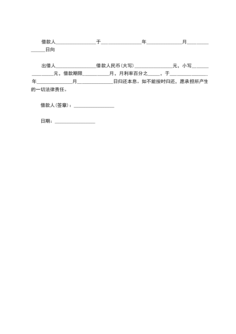 出借人_________________借款人民币(大写)________________元,小写________________元,借款期限___________月,月利率百分之_____,于________________年_______________月_______________日归还本息。如不能按时归还,愿承担所产生的一切法律责任。