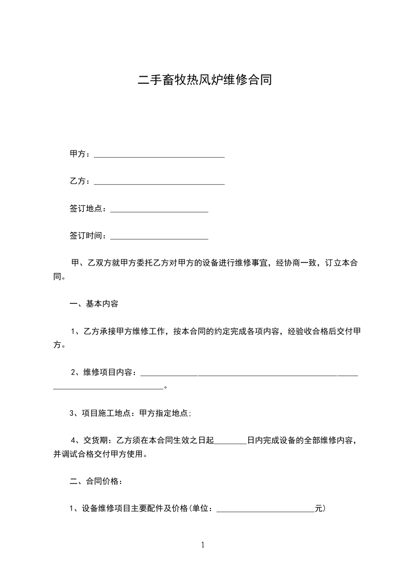 二手畜牧热风炉维修合同