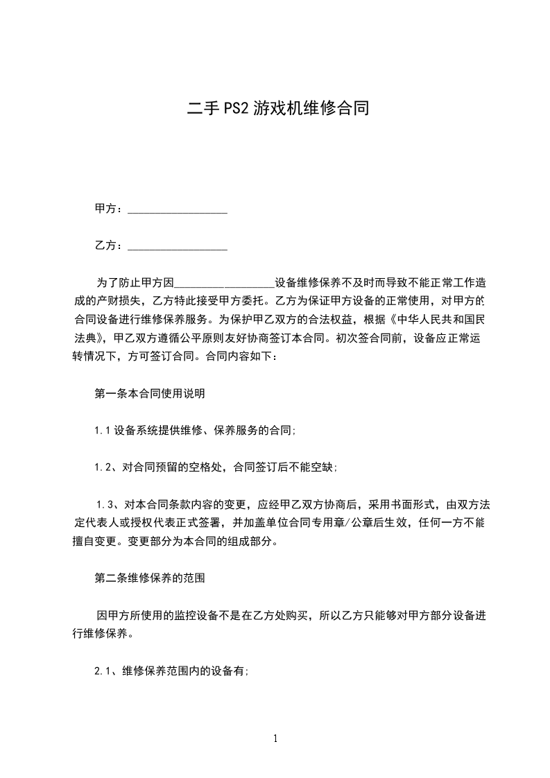 为了防止甲方因__________________设备维修保养不及时而导致不能正常工作造成的产财损失,乙方特此接受甲方委托。乙方为保证甲方设备的正常使用,对甲方的合同设备进行维修保养服务。为保护甲乙双方的合法权益,根据《中华人民共和国民法典》,甲乙双方遵循公平原则友好协商签订本合同。初次签合同前,设备应正常运转情况下,方可签订合同。合同内容如下: