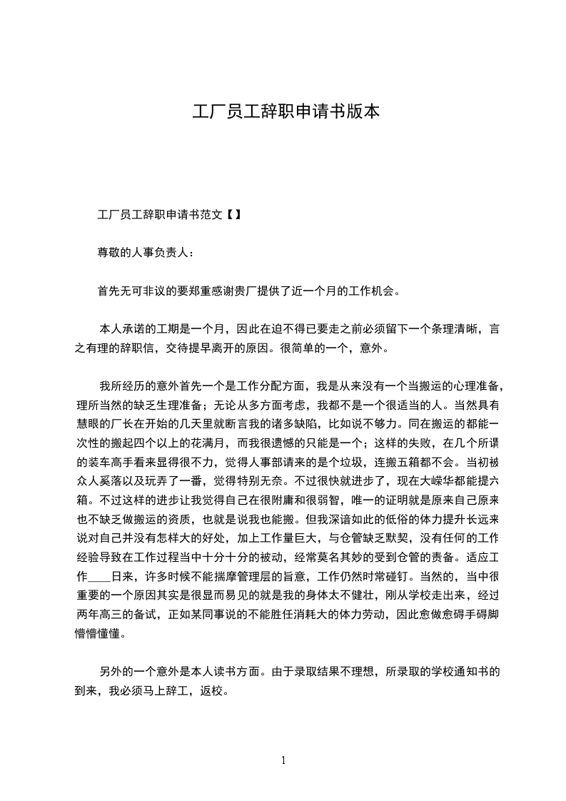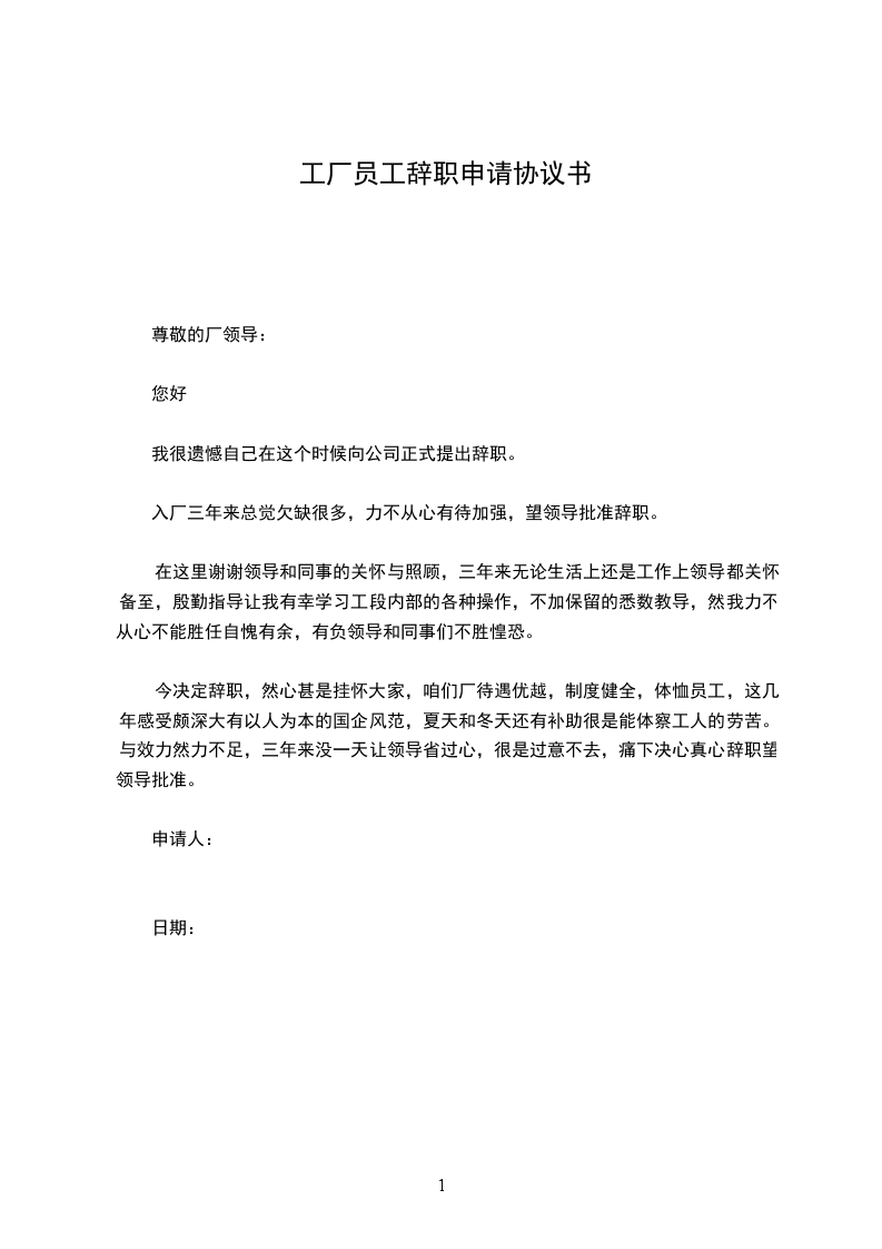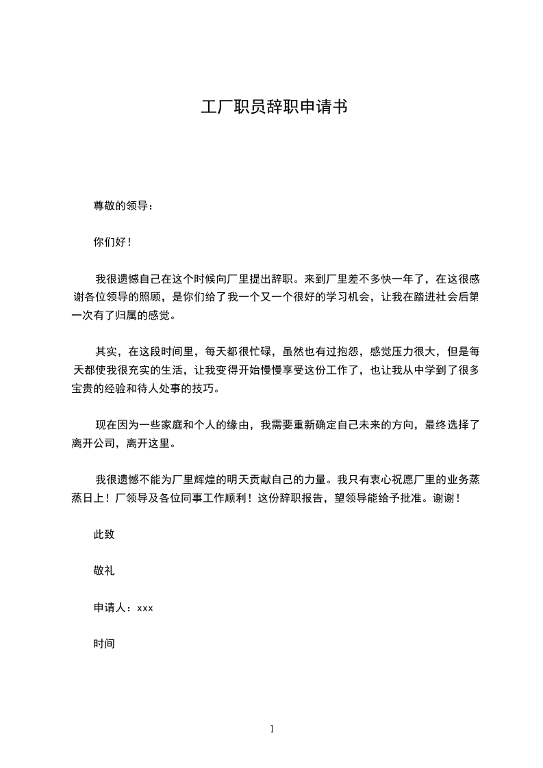 我很遗憾不能为厂里辉煌的明天贡献自己的力量。我只有衷心祝愿厂里的业务蒸蒸日上!厂领导及各位同事工作顺利!这份辞职报告,望领导能给予批准。谢谢!