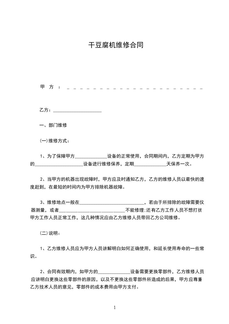 1、为了保障甲方______________设备的正常使用,合同期间内,乙方定期为甲方的_____________________设备进行维修保养,定期______________天保养一次。