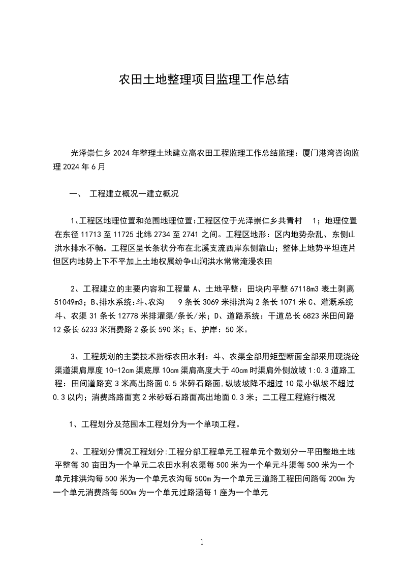 光泽崇仁乡2024年整理土地建立高农田工程监理工作总结监理:厦门港湾咨询监理2024年6月