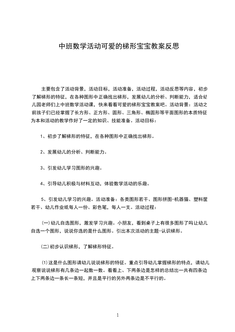 主要包含了活动背景,活动目标,活动准备,活动过程,活动反思等内容,初步了解梯形的特征,在各种图形中正确找出梯形,发展幼儿的分析、判断能力,适合幼儿园老师们上中班数学活动课,快来看看可爱的梯形宝宝教案吧。活动背景:活动之前孩子们已经掌握了长方形、正方形、圆形、三角形、椭圆形等平面图形的本质特征,为本和活动的教学作好了一定的知识、技能准备。活动目标: