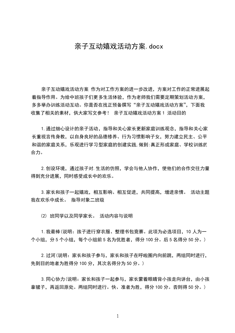 (3) 下次你想玩什么嬉戏?为什么? 亲子互动嬉戏活动方案2 活动目的:目前,在家庭训练中,亲子互动往往被爸爸妈妈所忽视。这对 亲密亲子关系和促进孩子身心健康进展是极大的损失。为了关心家进步一步学习亲子嬉戏的方式、方法,我广场打算开展亲子运动会来为孩子们带来一份美妙的回忆。 活动主题:大手牵小手,你我共成长 活动时间:2024年10月1日 活动场地:_商业广场中心 活动目标: