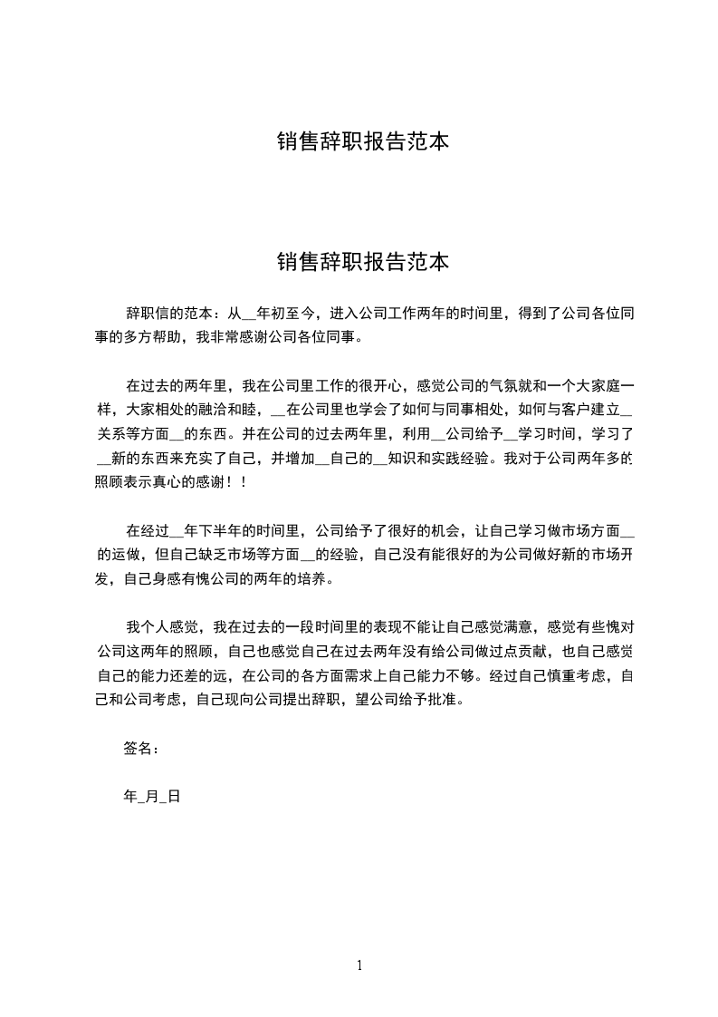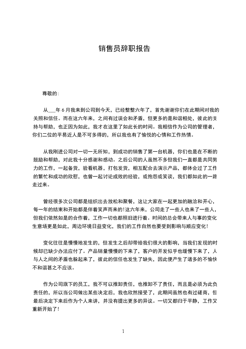 在这一年里我学到了很多,得到了很多。在贵公司这段时间将会是我一生中,都难以忘却的宝贵财富。同时这段时间里发现了自己很多不足之处,需要改进的地方也很多。在销售部的日子里,因为工作的关系,与同事朝夕相处,建立了深厚的友谊。我从内心希望这份友谊能继续并永久维持下去。但现在因为我个人以及家庭的原因,经过深思熟虑地思考,我不得不提出辞职,希望能于20xx年1月15日正式离职,请公司批准。并请公司在1月15日前安排好人员接替我的工作,我将尽心交接。对由此为公司造成的不便,我深感抱歉。同时也希望公司能体恤我的个人实际,对我的申请予以考虑并批准为盼。最后,我真心的希望贵公司能在今后的建设与发展旅途中步步为赢、蒸蒸日上!再次感激!此致敬礼!申请人:xxxxx年xx月xx日销售辞职报告篇4入公司工作两年的时间里,得到了公司各位同事的多方帮助,由衷非常感谢各位同事。在过去的两年里,我在公司里工作的很开心,感觉公司的气氛就和一个大家庭一样,大家相处的融洽和睦,在公司里也学会了如何与同事相处,如何与客户建立关系等方面的东西。并在公司的过去两年里,利用公司给予学习时间,学习了新的东西来充实了自己,并增加自己的知识和实践经验。我对于公司两年多的照顾表示真心的感谢!在经过年下半年的时间里,公司给予了很好的机会,让自己学习做市场的运做,但自己缺乏的经验,自己没有能很好的为公司做好新的市场开发,身感有愧公司的两年的培养。个人感觉,我在过去的一段时间里的表现不能让自己感觉满意,感觉有些愧对公司这两年的照顾,自己也感觉自己在过去两年没有给公司做过点贡献,也自己感觉自己的能力还差的远,在公司的各方面需求上自己能力不够。经过自己慎重考虑,自己和公司考虑,自己现向公司提出辞职,望公司给予批准。