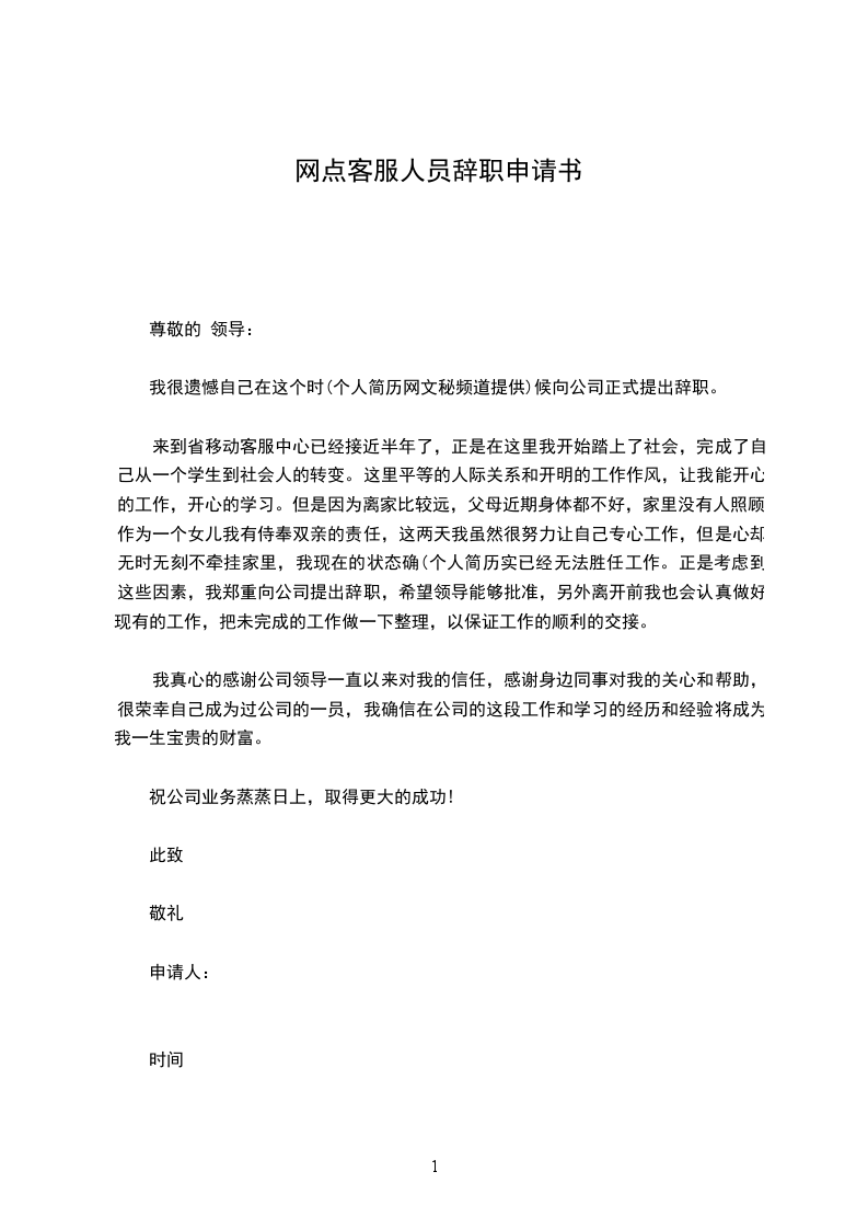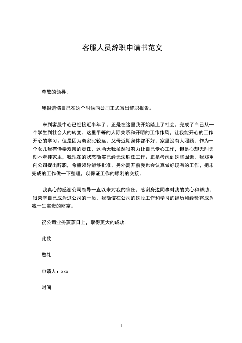 来到客服中心已经接近半年了,正是在这里我开始踏上了社会,完成了自己从一个学生到社会人的转变。这里平等的人际关系和开明的工作作风,让我能开心的工作,开心的学习。但是因为离家比较远,父母近期身体都不好,家里没有人照顾,作为一个女儿我有侍奉双亲的责任,这两天我虽然很努力让自己专心工作,但是心却无时无刻不牵挂家里,我现在的状态确实已经无法胜任工作。正是考虑到这些因素,我郑重向公司提出辞职,希望领导能够批准,另外离开前我也会认真做好现有的工作,把未完成的工作做一下整理,以保证工作的顺利的交接。