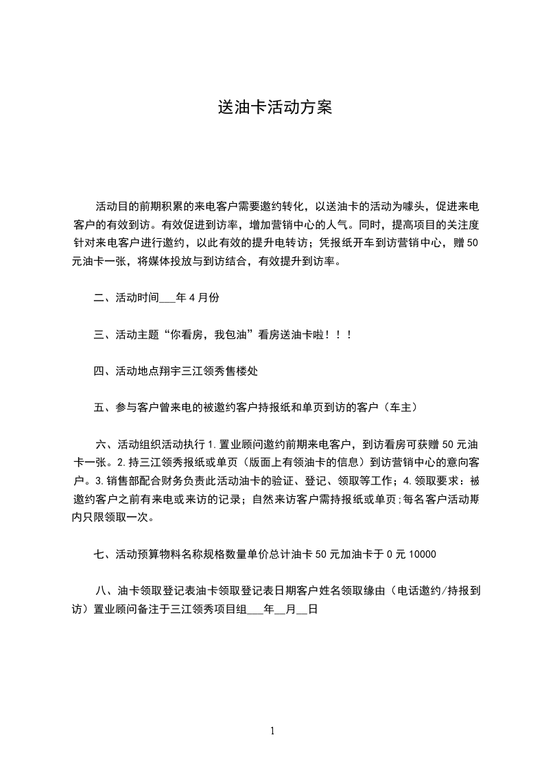 六、活动组织活动执行1.置业顾问邀约前期来电客户,到访看房可获赠50元油卡一张。2.持三江领秀报纸或单页(版面上有领油卡的信息)到访营销中心的意向客户。3.销售部配合财务负责此活动油卡的验证、登记、领取等工作;4.领取要求:被邀约客户之前有来电或来访的记录;自然来访客户需持报纸或单页;每名客户活动期内只限领取一次。