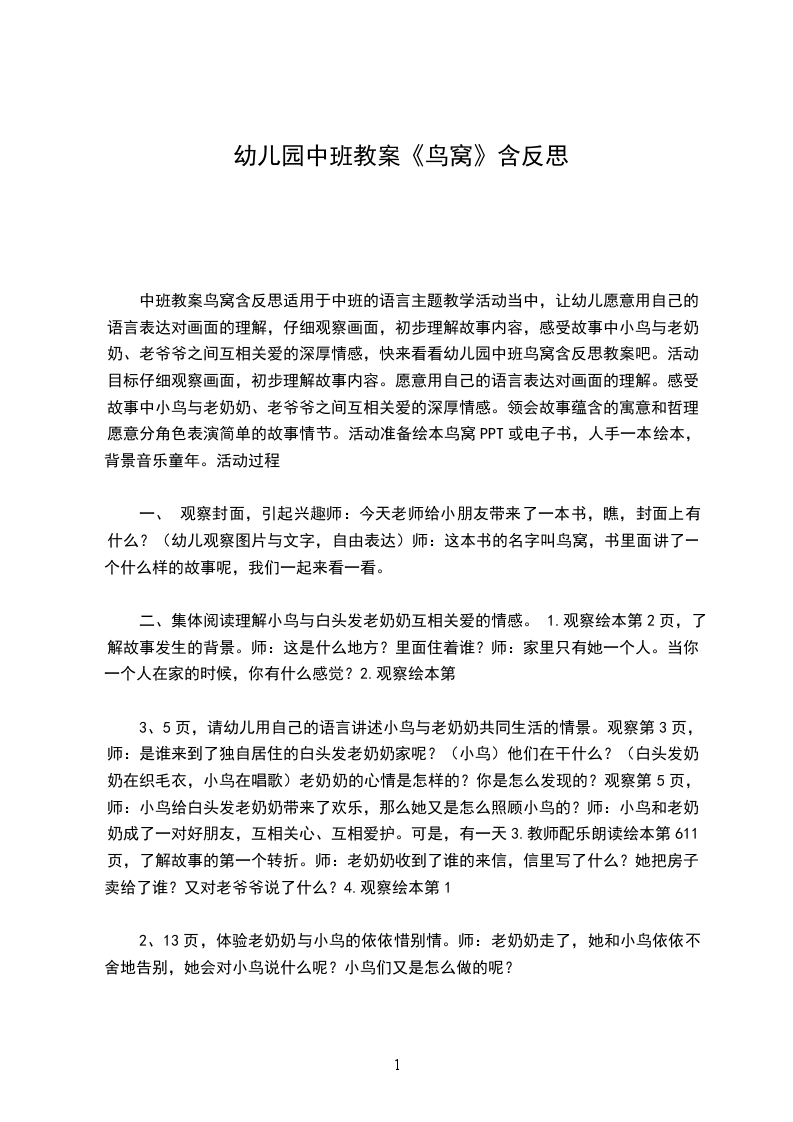 四、 小结师:今天我们看了一本好看的图画书,许多小朋友都会一页一页地翻,用好听的话介绍给大家听,还能告诉大家是第几页,下次我们再来仔细地找一找鸟窝的秘密。教学反思:今天,我上了一节语言活动鸟窝,活动目标是让幼儿初步理解故事情节,感受老奶奶和老爷爷对小鸟的热爱,以及人与自然的和谐之美。活动采用边听边理解,边提问探究的方式,从而帮助幼儿理解故事中的人物对小鸟和大自然的热爱之情。故事鸟窝,它以巧妙的构思,温暖、关爱的基调深深吸引着幼儿。于是我借助图片及幼儿用书设计了此次活动。我遵从简单、真实、自然、有效的教学原则,从幼儿的角度出发,分析幼儿学什么,怎么学。小百科:鸟体表被覆羽毛的卵生脊椎动物,鸟的主要特征是:身体呈流线型(纺锤型或梭形),大多数飞翔生活。