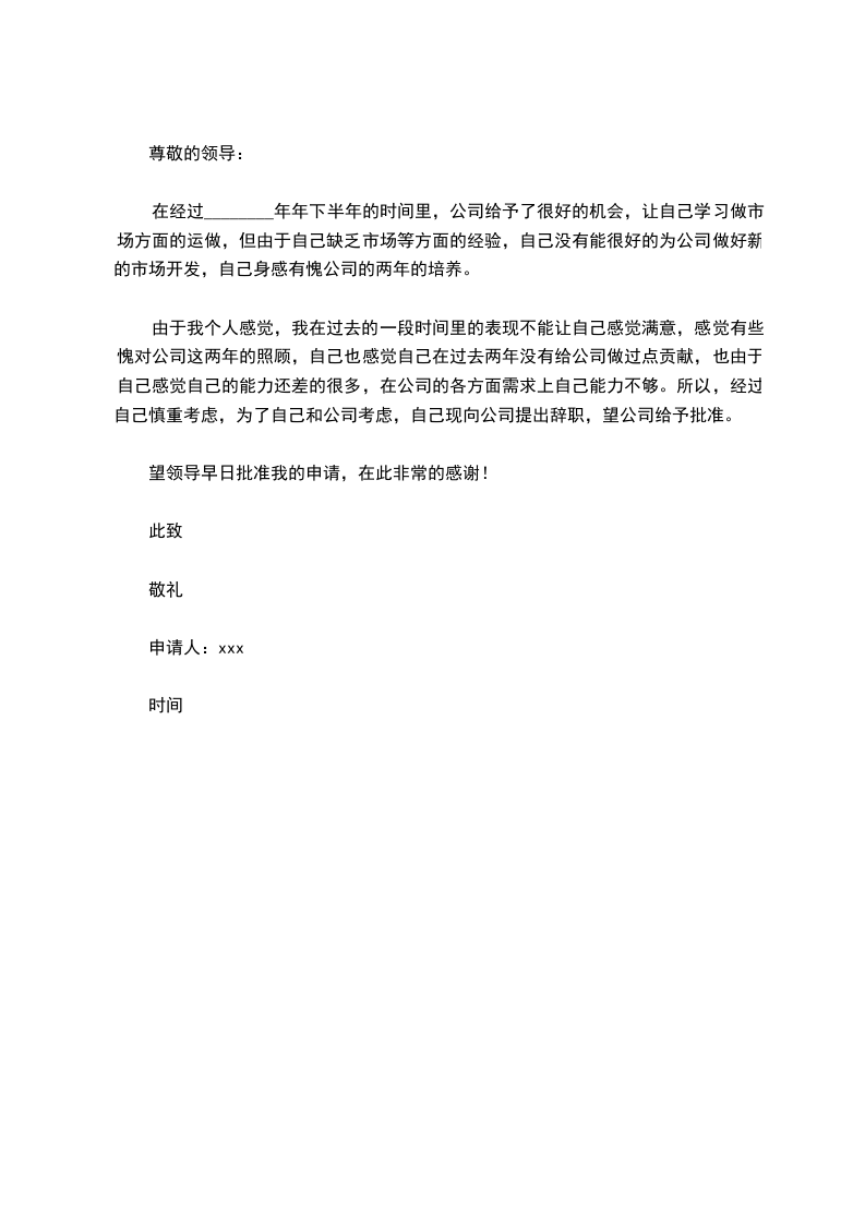 在经过________年年下半年的时间里,公司给予了很好的机会,让自己学习做市场方面的运做,但由于自己缺乏市场等方面的经验,自己没有能很好的为公司做好新的市场开发,自己身感有愧公司的两年的培养。