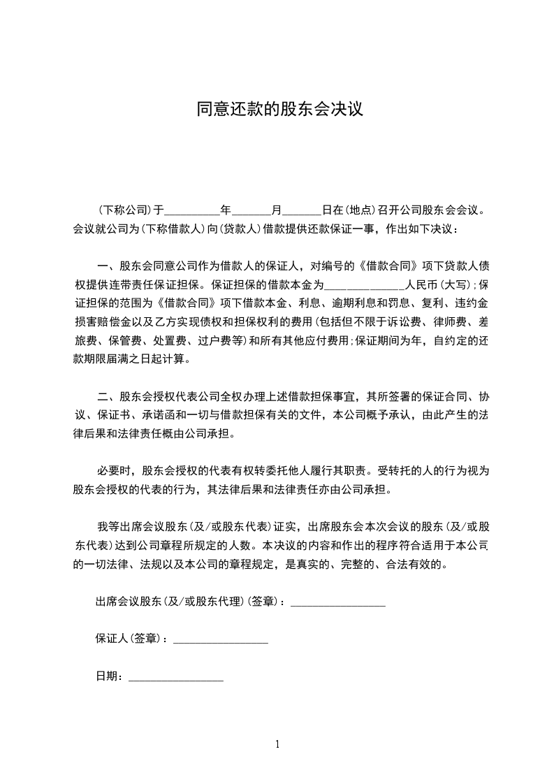 (下称公司)于__________年_______月_______日在(地点)召开公司股东会会议。会议就公司为(下称借款人)向(贷款人)借款提供还款保证一事,作出如下决议: