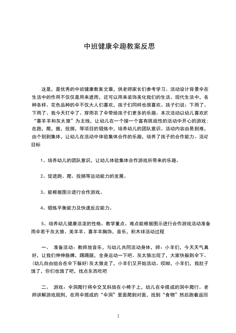 这是,是优秀的中班健康教案文章,供老师家长们参考学习。活动设计背景伞在生活中的作用不仅仅是用来遮雨,还可以用来装饰美化我们的生活。现代生活中,各种各样、花色品种的伞不仅大人们喜欢,孩子们同样也很喜欢。孩子们说:下雨了、下雨了、我今天打伞了、穿雨衣了伞带给孩子们更多的乐趣。本次活动以幼儿喜欢的“喜羊羊和灰太狼”为主线,让幼儿在一个接一个富有挑战性的活动中开心的游戏;在跑,爬,搬,投掷,等项目的锻炼中,培养幼儿的团队意识。活动内容由易到难,由个别到集体,让幼儿在活动中体验集体合作的乐趣,培养了孩子的合作能力。活动目标