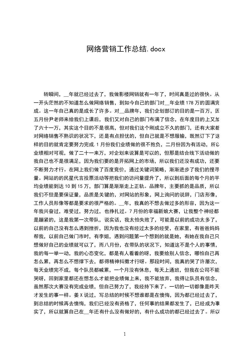 转瞬间,__年就已经过去了,我做影楼网销就有一年了,时间真是过的很快。从一开头茫然的不知道怎么做网络销售,到如今自己的部门对__年业绩178万的圆满完成。这一年自己真的是成长了许多。对__品牌年,我们企划部订的目的是一百万,因五月份尹老师来给我们上课后,我们又对自己的部门布满了信念,在年度目的上又加了六十一万,其实这个目的不是很高,但对我们这个刚成立不久的部门,还有大家都对网络销售不熟识的状况下,还是有点担忧的,但自己就是不想服输,既然订下了这样的目的就肯定要努力完成.1月份我们业绩做的很不抱负,二月份因为有活动,所以业绩相对可观,做了二十一来万,对企划来说算是可以的,但那是结合线下活动做的,我自己也不是很满足,因为我们要的是开拓网上的市场,所以我们还没有成功,还要不断努力才行。在网上我们做了百度竞价,通过关键词策略,渐渐进步了我们的搜寻量。网站的的民星代言投票活动等把我们的访问量提升了,所以到后面的每个月的平均业绩能到达10到15万,部门算是渐渐走上正轨。品牌年,主要抓的是品质,所以我们不但是要保证量,品质是关键的,对网站的形象,网上询问的说辞,门店形像,工作人员形像等都是要求的很严格的。__年,我真的不想去做过多的形容,因为这一年我兴奋过,难受过,努力过,也挣扎过。7月份的幸福新娘大赛,让我整个神经都是蹦紧的,这是我第一次带队,说实话,我太怕失败了,可能是以前的成功太多了,以前的自己没有怎么遇到挫折,因为我也没有经过太多的经受,在家里,有爸爸妈妈帮我,以前自己做门市时,有李姐,遇到问题第一个想到的就是她,有她在我自己只想做好自己的业绩就可以了,而八月份,在带队的状况下,知道这不是个人的事情,我的每一举一动,我的心态变化,都是有人看着的呀,我要给别人信念,哪怕自己再怎么累,再怎么不想撑下去,都得精神抖擞才行呀。那段时间,我真的哭了许屡次,每天业绩完不成,每个队员都喊累,一个月没有休息,每天上通班,但我在公司不能哭呀,回到家里都还在想怎么才能把业绩做上来,我不能放弃,我得让队员有信念,虽然那次大赛没有完成业绩,但自己努力了,我经持下来了。一切的一切都像是昨天才发生的事一样。姜X说过,写总结的时候不想谁都是在懊悔,因为都已经过去了,到总结的时候再去懊悔,我们已经没有资格了,任何事的结果都发生了,已经成为事实了,所以就算自己在__年还有什么没有做好的,有什么成功的都已经过去了。所以我们要把握的是如今,每一次的失败与经受都鞭策我们前进,想想我们的六年大计,我们要的是不断加油,要的是离目的更近。__年是关键的一年,如今公司的四大品牌都已经在玩网络了,假设我们企划部自己还不努力的话,怎么能行呢,别人都在做我们的市场了,所以我们只能是前进了,把自己的部门当做一个公司来经营,聚焦好自己的目的,我们要的就是业绩就是市场,肯定把网撒的更宽。企划部展业的业绩也是关键的,不光是线上,线下我们也得努力,既然门店都可以线下线上一起做,我们为什么要把我们的线下放下呢,所以一切以完成业绩目的为导向,聚焦好这件事,企划部肯定会更强大。__年新年钟声敲响的那一刻,我哭了。也不知道为什么眼泪就流下来了,太多的感慨,因为时间是由不得人的。__年,大家都在传,地球将在这一年消灭,但地球真的就在这一刻没有了吗我觉得这是大家在躲避责任的说法,__年莫非我们就不生存了吗不工作了吗不是,只要活一天,心中就得有目的,聚焦好工作重点:市场业绩网络。__年,把我们的市场扩大化,把微薄营销做透,让自己不留圆满。加油!