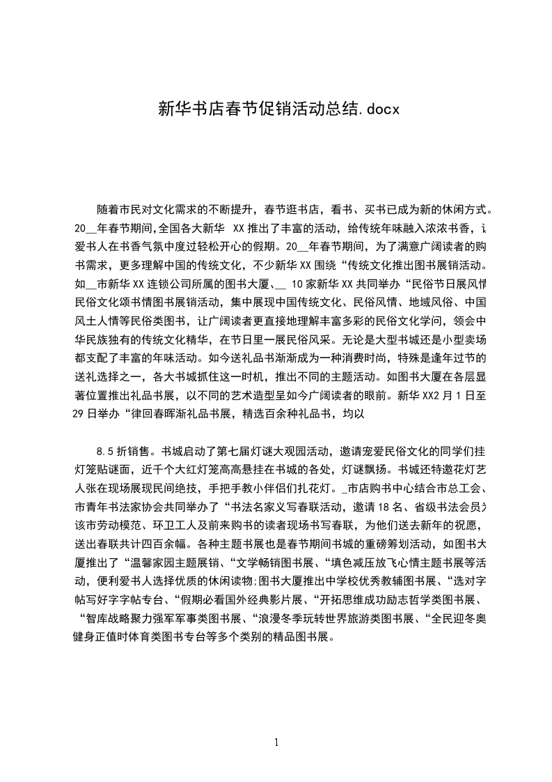 随着市民对文化需求的不断提升,春节逛书店,看书、买书已成为新的休闲方式。20__年春节期间,全国各大新华XX推出了丰富的活动,给传统年味融入浓浓书香,让爱书人在书香气氛中度过轻松开心的假期。20__年春节期间,为了满意广阔读者的购书需求,更多理解中国的传统文化,不少新华XX围绕“传统文化推出图书展销活动。如__市新华XX连锁公司所属的图书大厦、__10家新华XX共同举办“民俗节日展风情民俗文化颂书情图书展销活动,集中展现中国传统文化、民俗风情、地域风俗、中国风土人情等民俗类图书,让广阔读者更直接地理解丰富多彩的民俗文化学问,领会中华民族独有的传统文化精华,在节日里一展民俗风采。无论是大型书城还是小型卖场,都支配了丰富的年味活动。如今送礼品书渐渐成为一种消费时尚,特殊是逢年过节的送礼选择之一,各大书城抓住这一时机,推出不同的主题活动。如图书大厦在各层显著位置推出礼品书展,以不同的艺术造型呈如今广阔读者的眼前。新华XX2月1日至29日举办“律回春晖渐礼品书展,精选百余种礼品书,均以