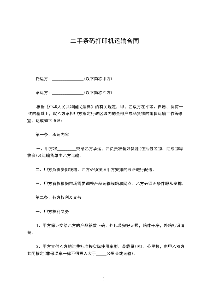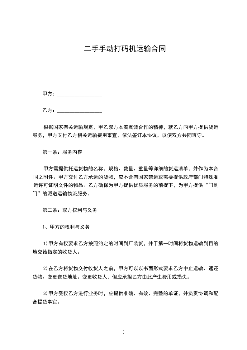 二手手动打码机运输合同