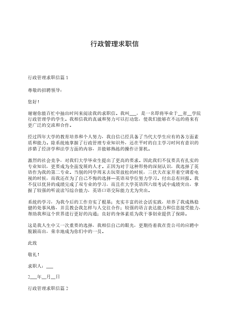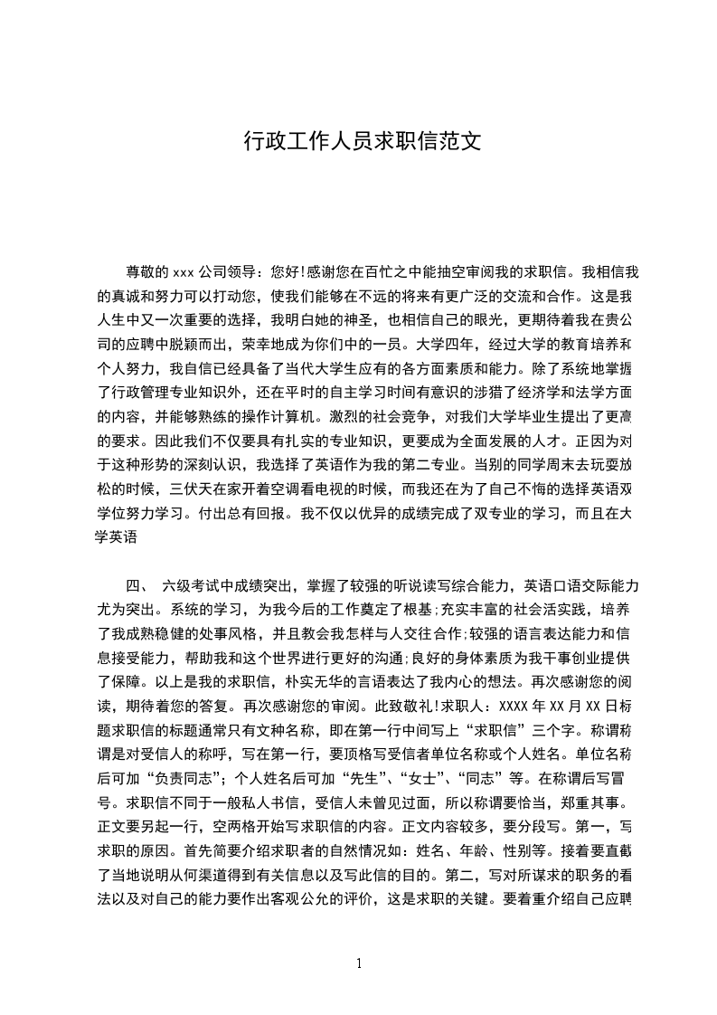 尊敬的xxx公司领导:您好!感谢您在百忙之中能抽空审阅我的求职信。我相信我的真诚和努力可以打动您,使我们能够在不远的将来有更广泛的交流和合作。这是我人生中又一次重要的选择,我明白她的神圣,也相信自己的眼光,更期待着我在贵公司的应聘中脱颖而出,荣幸地成为你们中的一员。大学四年,经过大学的教育培养和个人努力,我自信已经具备了当代大学生应有的各方面素质和能力。除了系统地掌握了行政管理专业知识外,还在平时的自主学习时间有意识的涉猎了经济学和法学方面的内容,并能够熟练的操作计算机。激烈的社会竞争,对我们大学毕业生提出了更高的要求。因此我们不仅要具有扎实的专业知识,更要成为全面发展的人才。正因为对于这种形势的深刻认识,我选择了英语作为我的第二专业。当别的同学周末去玩耍放松的时候,三伏天在家开着空调看电视的时候,而我还在为了自己不悔的选择英语双学位努力学习。付出总有回报。我不仅以优异的成绩完成了双专业的学习,而且在大学英语