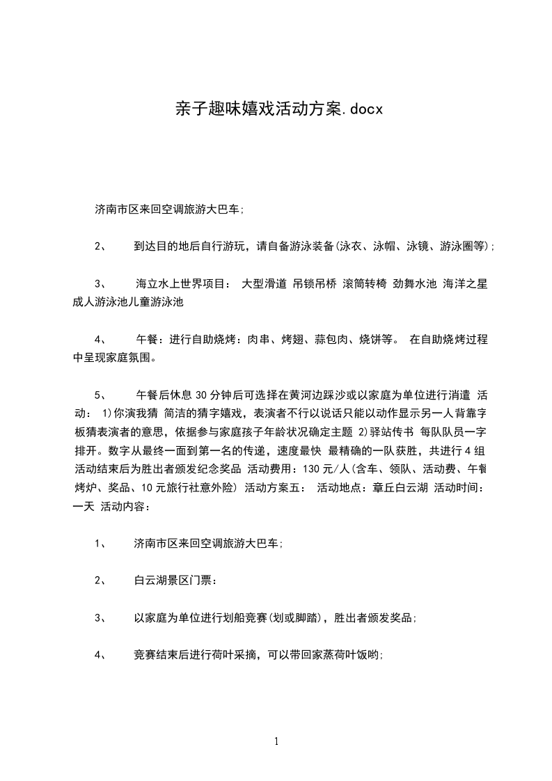 5、 午餐后休息30分钟后可选择在黄河边踩沙或以家庭为单位进行消遣 活动: 1)你演我猜 简洁的猜字嬉戏,表演者不行以说话只能以动作显示另一人背靠字板猜表演者的意思,依据参与家庭孩子年龄状况确定主题 2)驿站传书 每队队员一字排开。数字从最终一面到第一名的传递,速度最快 最精确的一队获胜,共进行4组 活动结束后为胜出者颁发纪念奖品 活动费用:130元/人(含车、领队、活动费、午餐、烤炉、奖品、10元旅行社意外险) 活动方案五: 活动地点:章丘白云湖 活动时间:一天 活动内容:
