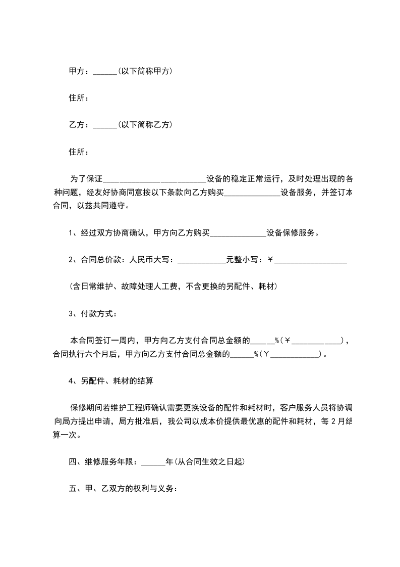 1、经过双方协商确认,甲方向乙方购买______________设备保修服务。