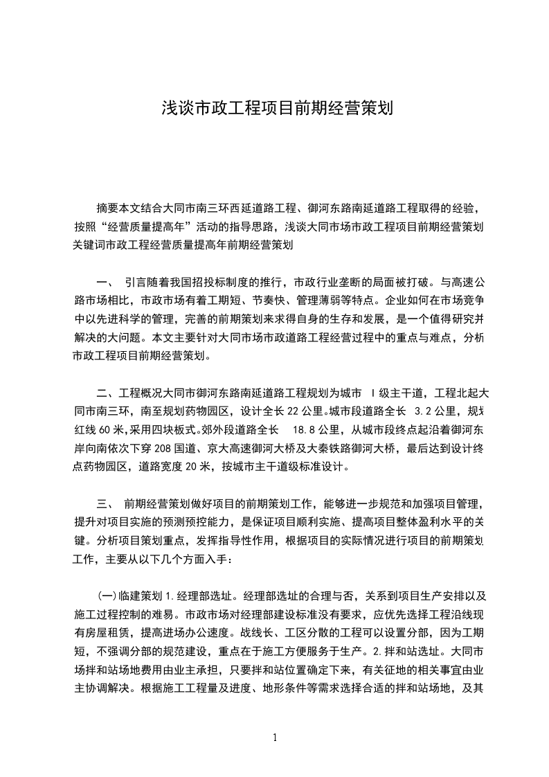摘要本文结合大同市南三环西延道路工程、御河东路南延道路工程取得的经验,按照“经营质量提高年”活动的指导思路,浅谈大同市场市政工程项目前期经营策划。关键词市政工程经营质量提高年前期经营策划