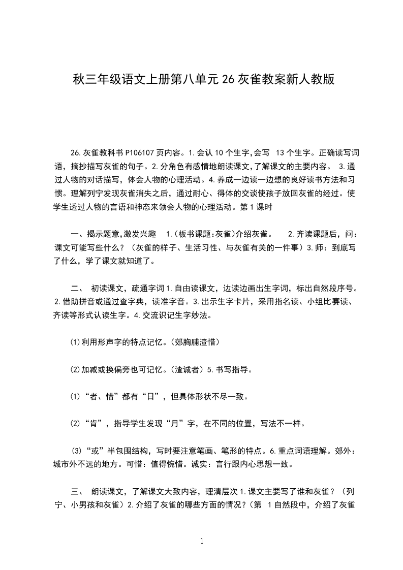 26.灰雀教科书P106107页内容。1.会认10个生字,会写13个生字。正确读写词语,摘抄描写灰雀的句子。2.分角色有感情地朗读课文,了解课文的主要内容。3.通过人物的对话描写,体会人物的心理活动。4.养成一边读一边想的良好读书方法和习惯。理解列宁发现灰雀消失之后,通过耐心、得体的交谈使孩子放回灰雀的经过。使学生透过人物的言语和神态来领会人物的心理活动。第1课时