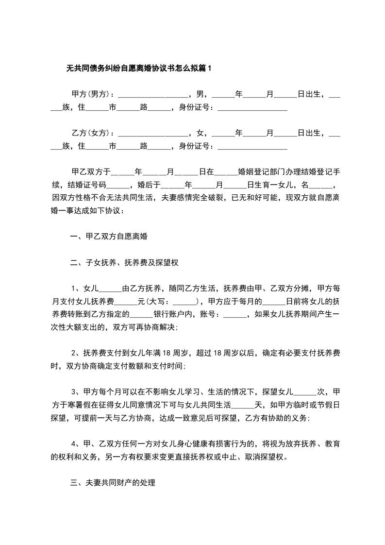 无共同债务纠纷夫妻自愿离婚协议范文篇1