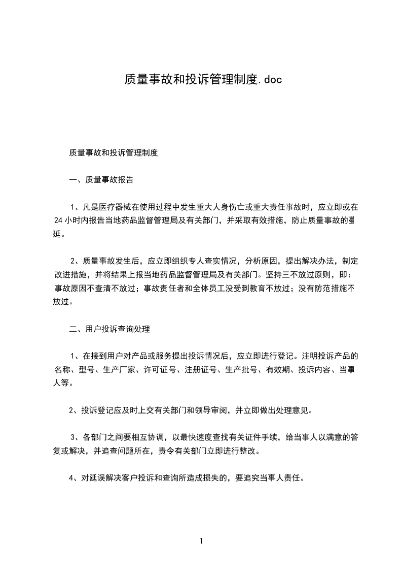 5、内容:5.1质量事故具体指药品经营活动各环节中,因药品质量问题而发生的危及人身健康安全或导致经济损失的异常情况;质量投诉是在经营活动各环节中因药品质量问题而发生的投诉。5.2质量事故按其性质和后果的严重程度分为:重大质量事故和一般质量事故。5.3发生重大质量事故,造成人身伤亡或性质恶劣、影响很坏的,门店必须在12小时内报公司总经理室、质管科,由质管科在24小时内报上级部门。5.4其他重大质量事故也应24小时由公司及时向当地药品监督管理部门汇报,查清原因后再作书面汇报,一般不得超过7天。5.5一般质量事故应在2个工作日内报质量管理部门,并在一个月内将事故原因、处理结果报质管科。5.6发生事故后,单位和个人要抓紧通知各有关部门采取必要的制止、补救措施,以免造成更大的损失和后果。5.7以事故为根据,组织人员认真分析,确认事故原因,明确有关人员的责任,提出整改措施。5.8对于质量投诉,门店人员受理质量投诉应妥善做好投诉人员的相关情绪安抚工作,不能让质量投诉升级为更大的质量问题,及时向公司质管科和门店负责人进行汇报,做好对投诉人员的解释和处理工作,并做好记录备查。