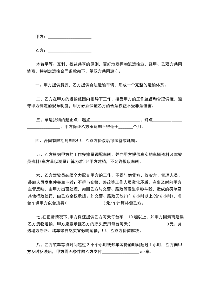 7、乙方承运危险,贵重货物时,行车手续必须齐全,并在保险公司办理货物保险手续方可运行,如乙方隐瞒事实,造成后果均由乙方全部承担。