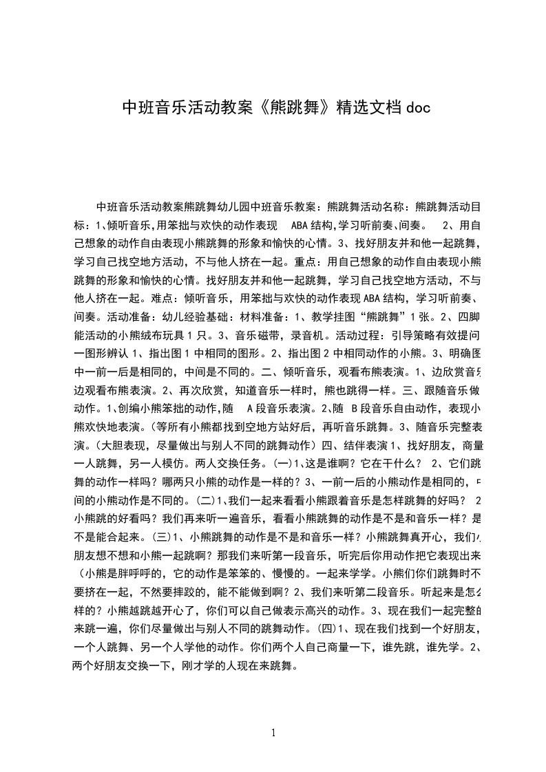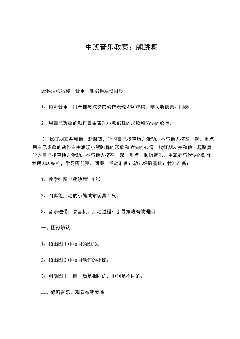 3、找好朋友并和他一起跳舞,学习自己找空地方活动,不与他人挤在一起。重点:用自己想象的动作自由表现小熊跳舞的形象和愉快的心情。找好朋友并和他一起跳舞,学习自己找空地方活动,不与他人挤在一起。难点:倾听音乐,用笨拙与欢快的动作表现ABA结构,学习听前奏、间奏。活动准备:幼儿经验基础:材料准备: