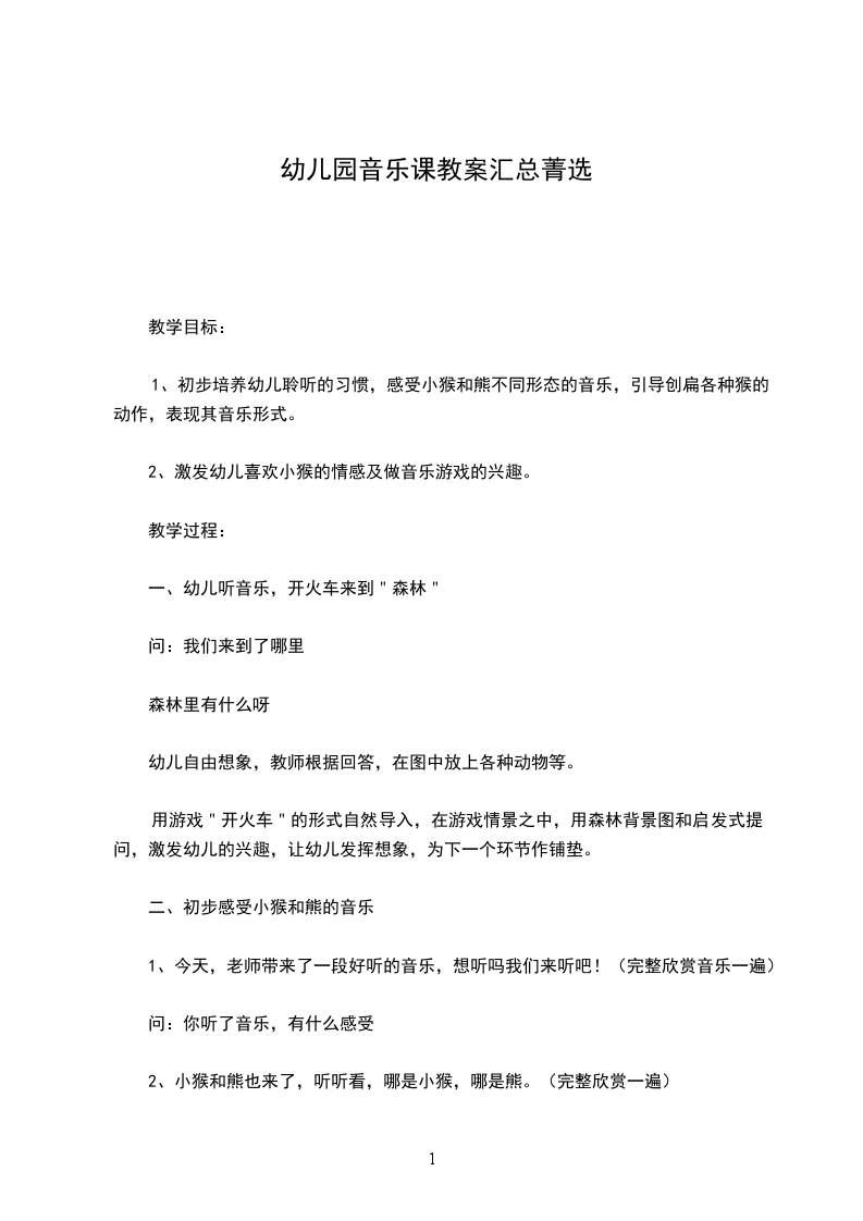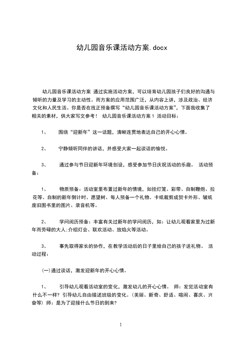 幼儿园音乐课活动方案 通过实施活动方案,可以培育幼儿园孩子们良好的沟通与倾听的力量及学习的主动性。而方案的应用范围广泛,从内容上讲,涉及政治、经济、文化和人民生活。你是否在找正预备撰写“幼儿园音乐课活动方案”,下面我收集了相关的素材,供大家写文参考! 幼儿园音乐课活动方案1 活动目标: