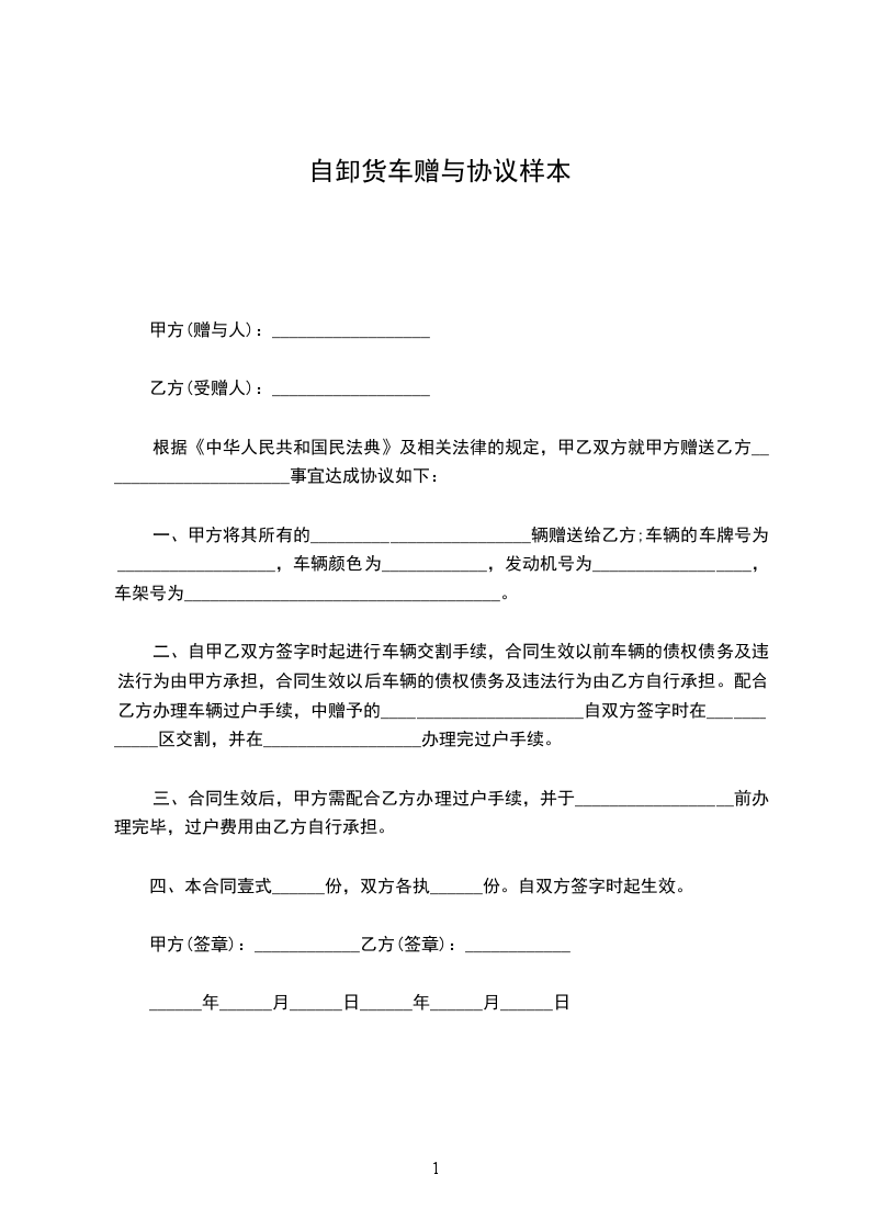 一、甲方将其所有的_________________________辆赠送给乙方;车辆的车牌号为__________________,车辆颜色为____________,发动机号为__________________,车架号为____________________________________。
