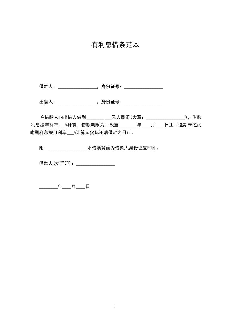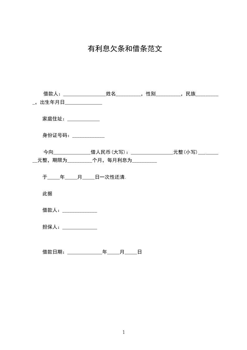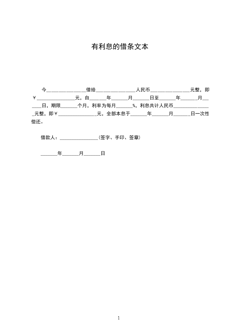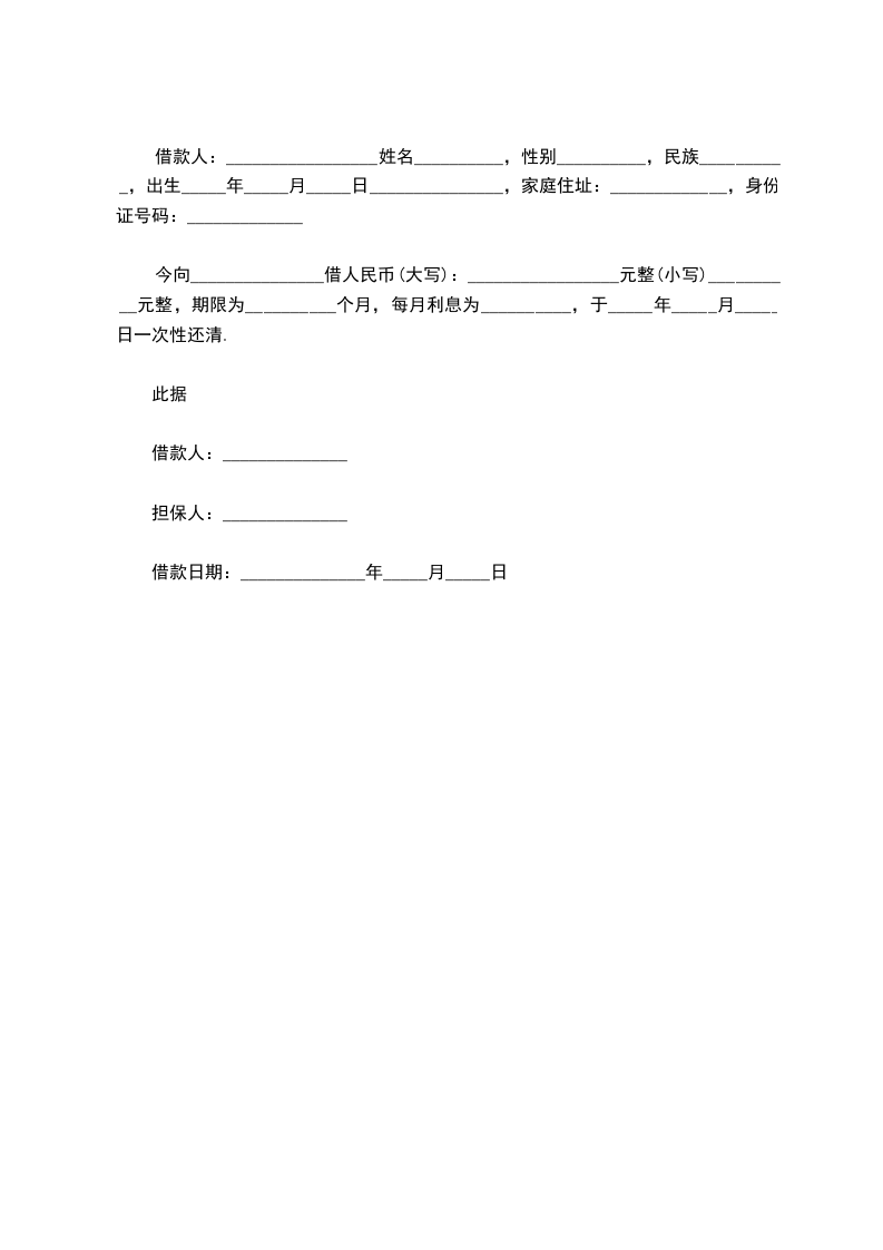 今向_______________借人民币(大写):_________________元整(小写)__________元整,期限为__________个月,每月利息为__________,于_____年_____月_____日一次性还清.