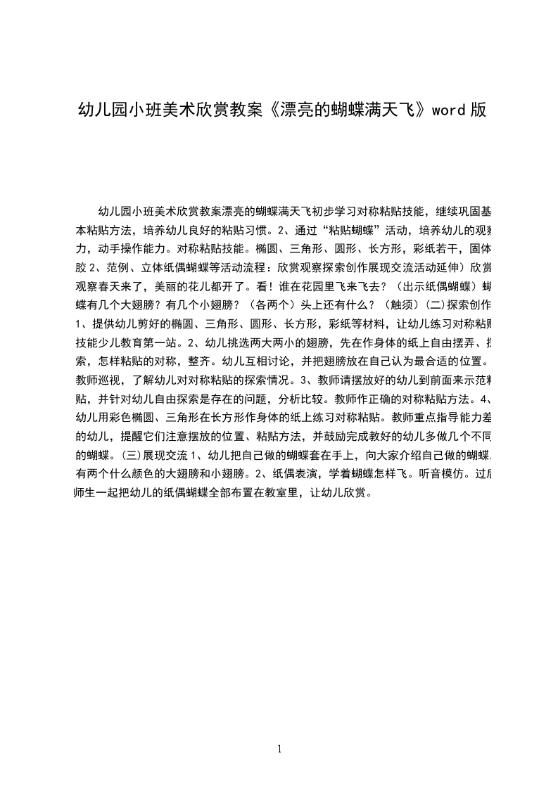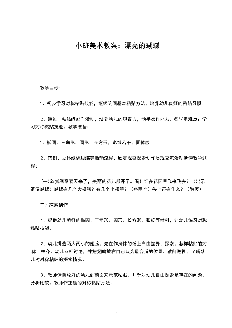(一)欣赏观察春天来了,美丽的花儿都开了。看!谁在花园里飞来飞去?(出示纸偶蝴蝶)蝴蝶有几个大翅膀?有几个小翅膀?(各两个)头上还有什么?(触须)