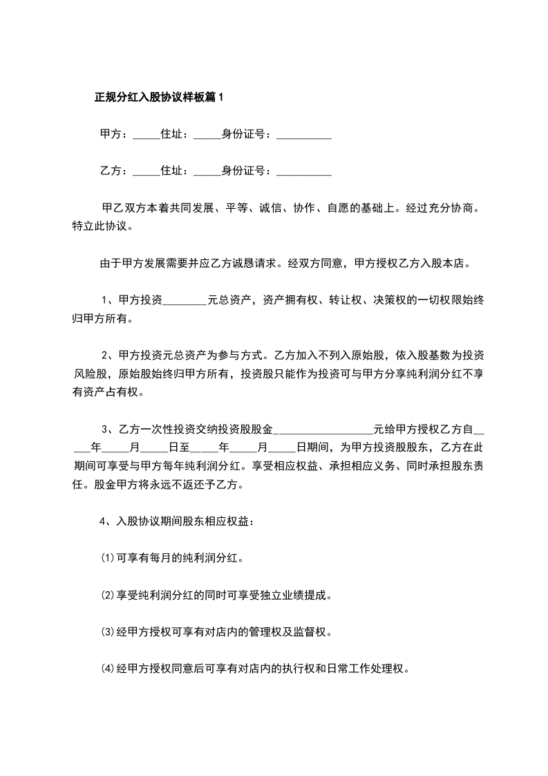 3、乙方一次性投资交纳投资股股金__________________元给甲方授权乙方自_____年_____月_____日至_____年_____月_____日期间,为甲方投资股股东,乙方在此期间可享受与甲方每年纯利润分红。享受相应权益、承担相应义务、同时承担股东责任。股金甲方将永远不返还予乙方。